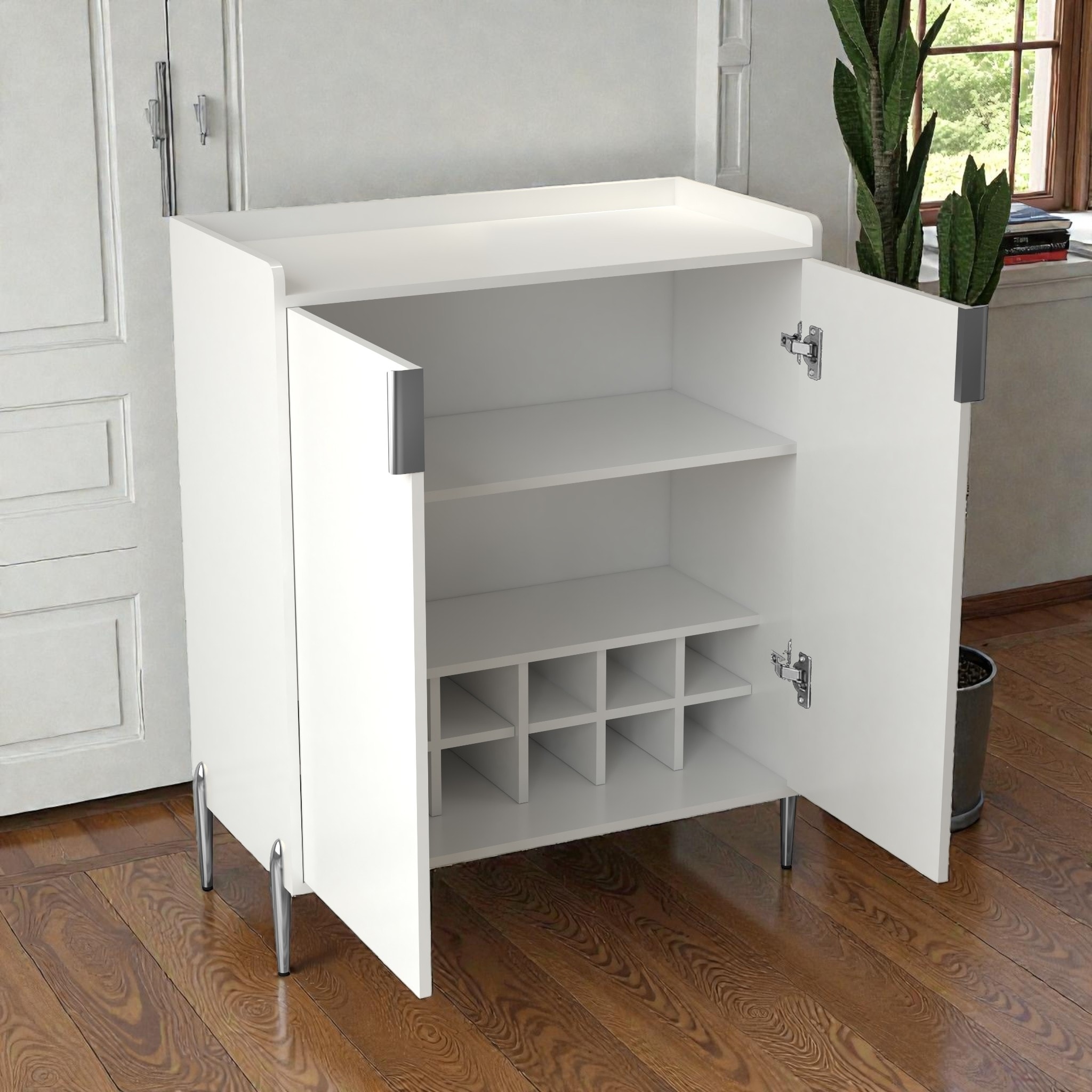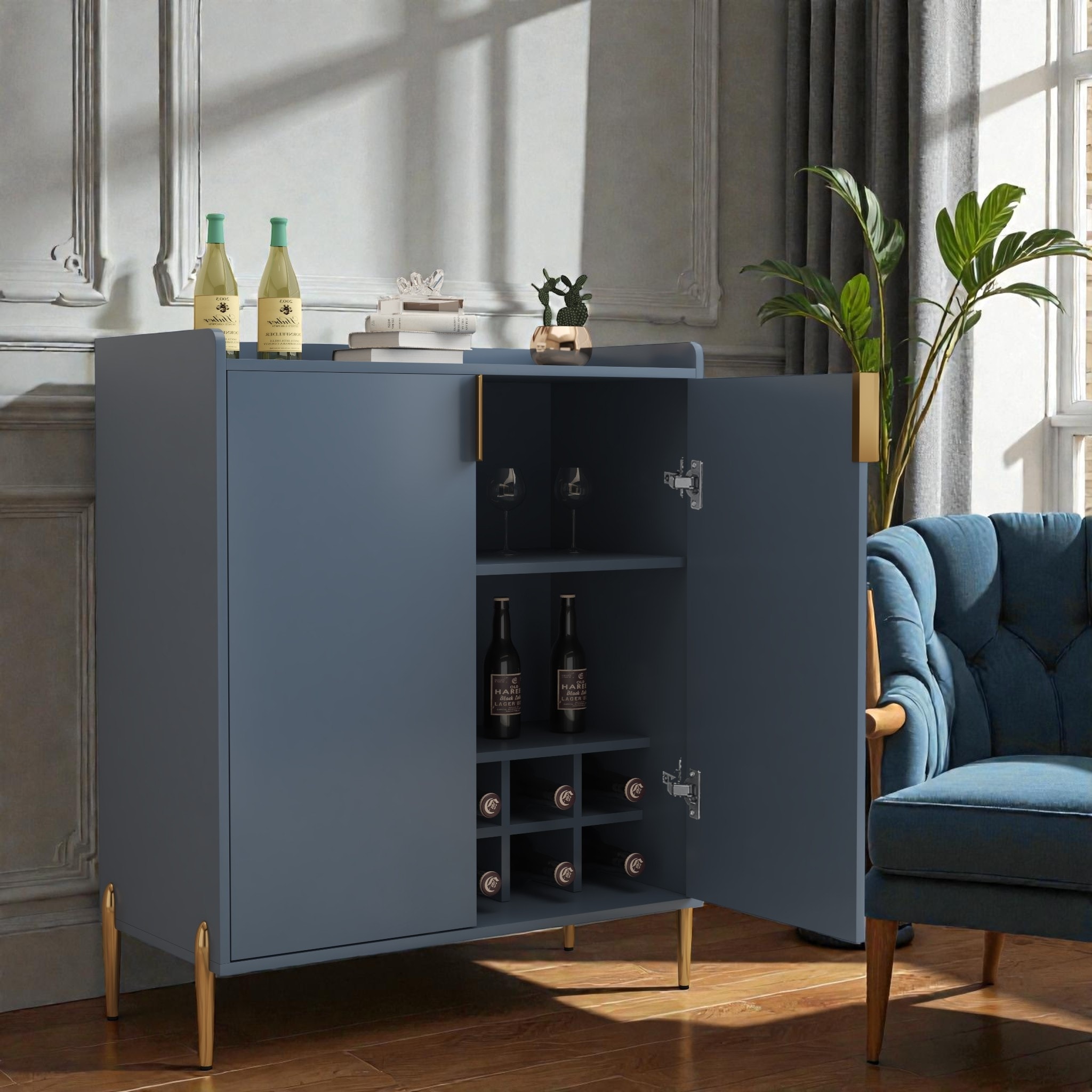 Modern Buffet Cabinet Light Blue Sideboard Entryway Cabinet with 2 Drawers, 8 Wine Bottle Storage Slots & 4 Wine Glass Rack