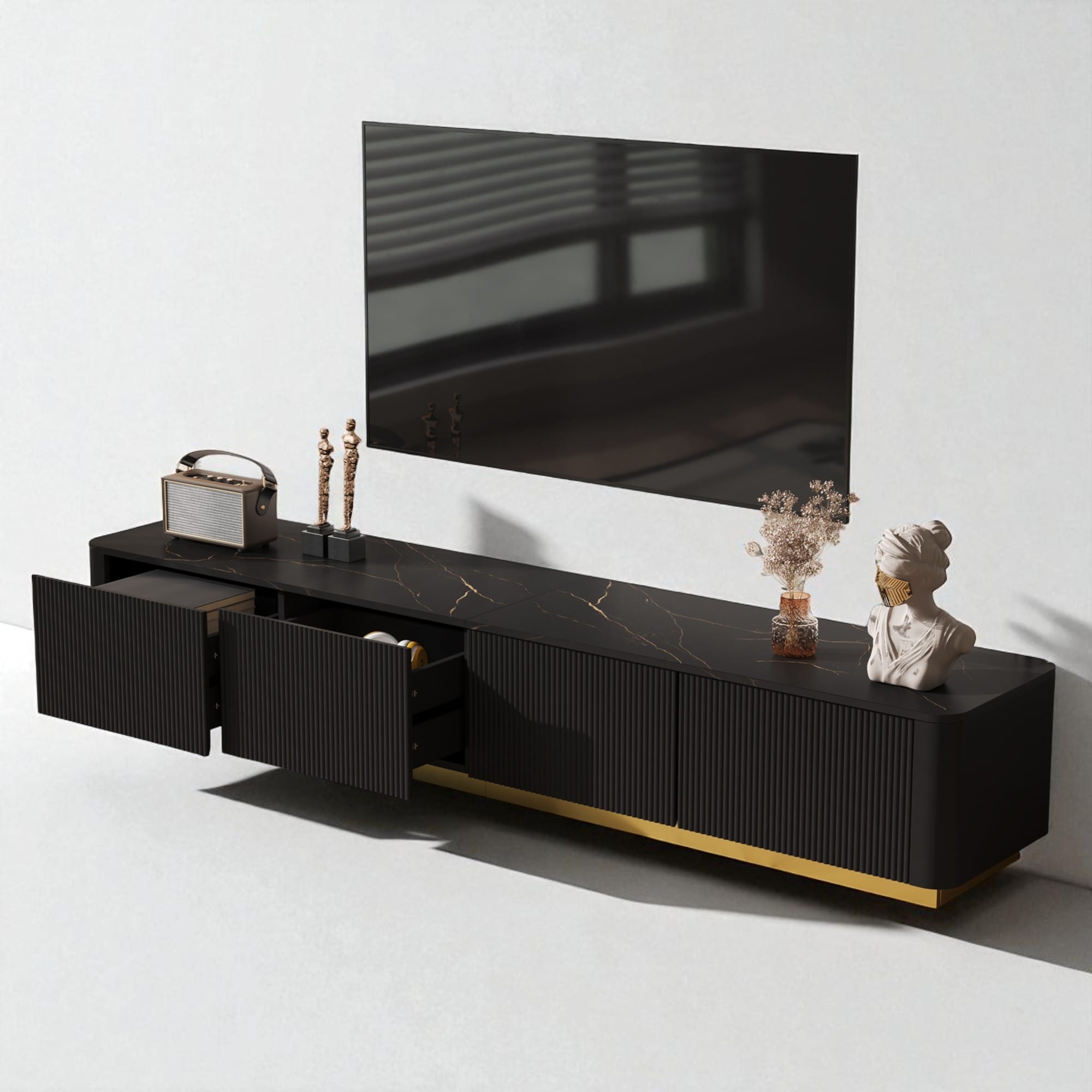 Luxury Fluted TV Stand for TVs Up to 85", Modern Media Console with Faux Marble Top, 4 Drawers and Gold Base
