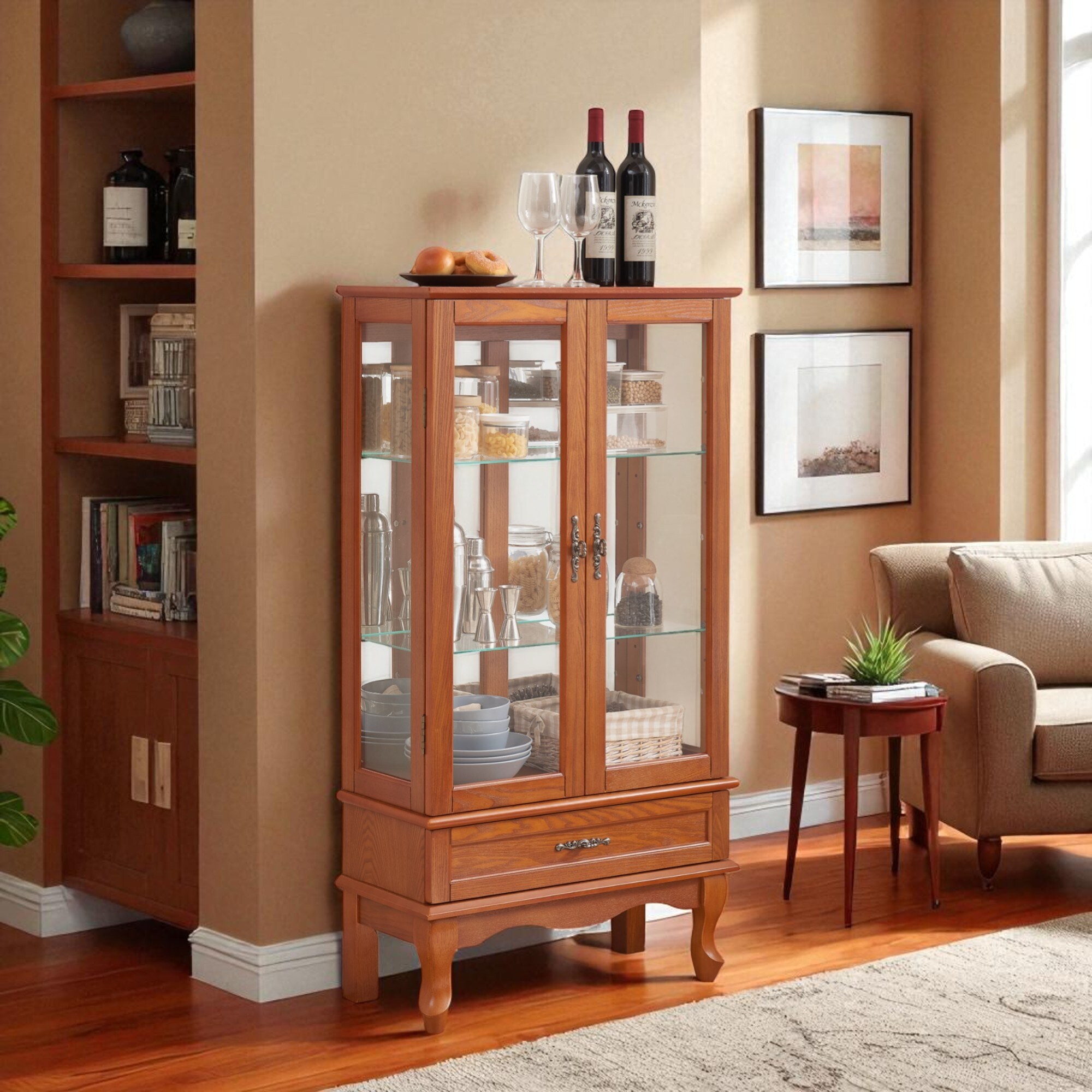 Lighted Glass Display Cabinet with Adjustable Glass Shelves, 2 Doors & 1 Drawer, Bulb Included -Curio Wine Cabinet for Storage