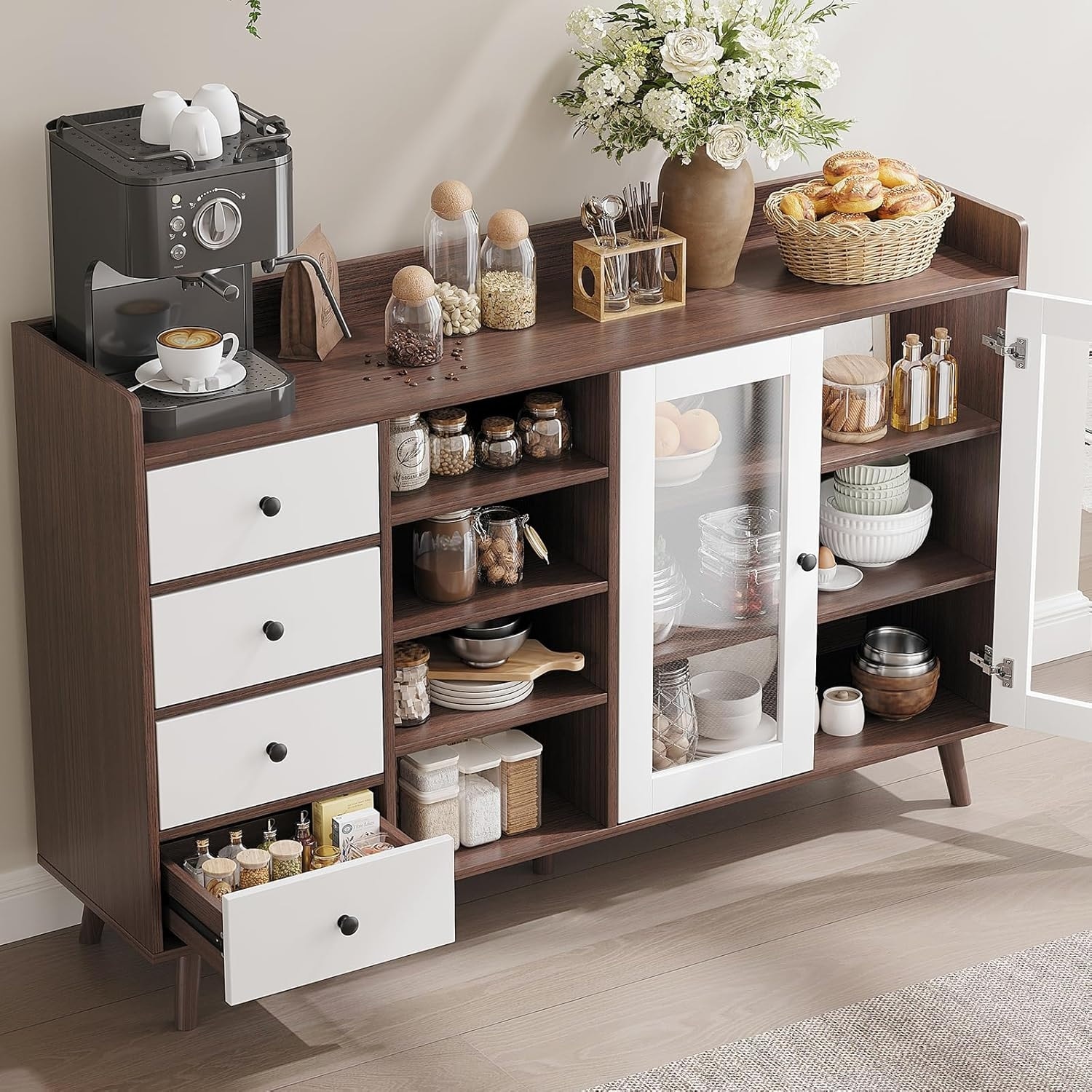 55.1" Modern Sideboard Buffet Cabinet with 4 Doors, Open Shelf, Adjustable Shelves & Side Hooks for Living Room or Dining