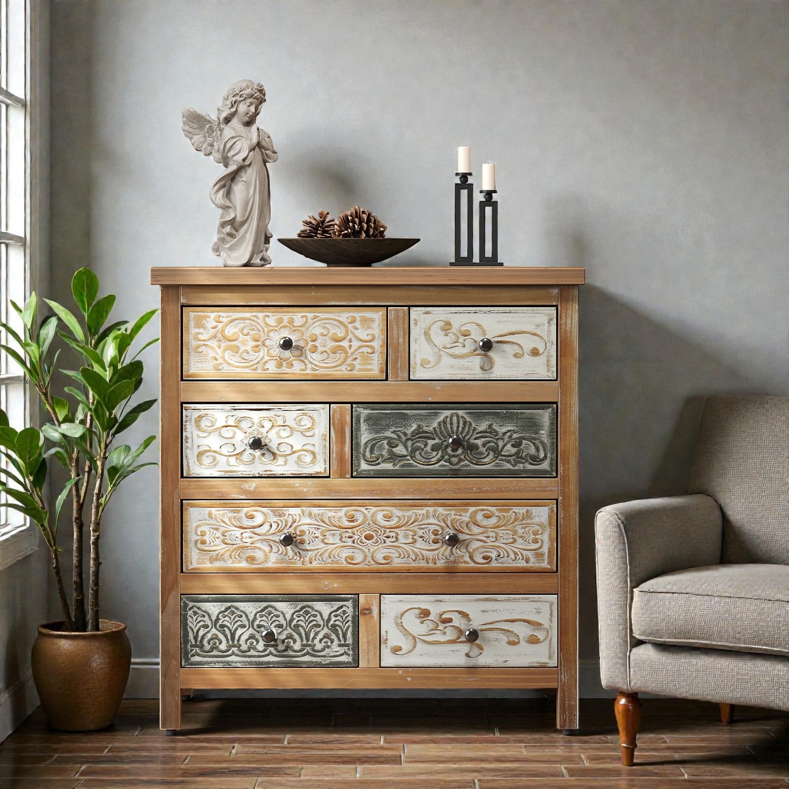Vintage Wooden Accent Chest with 6 Drawers, Rustic Multicolor Carved Dresser for Bedroom, Living Room and Farmhouse Decor