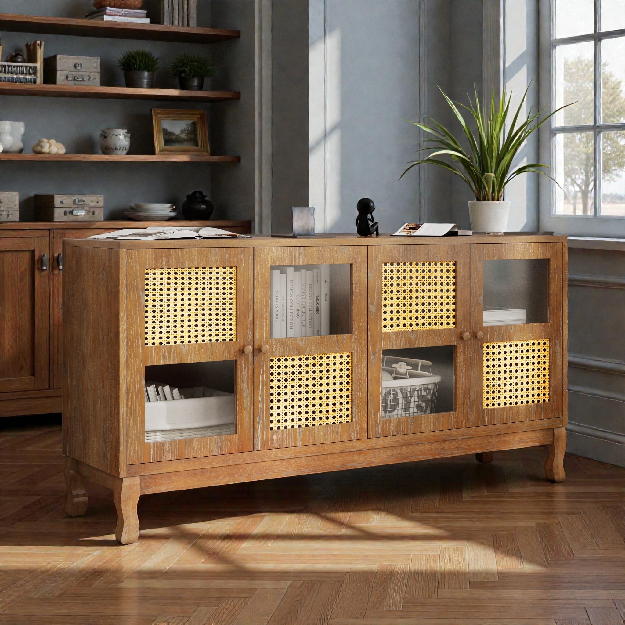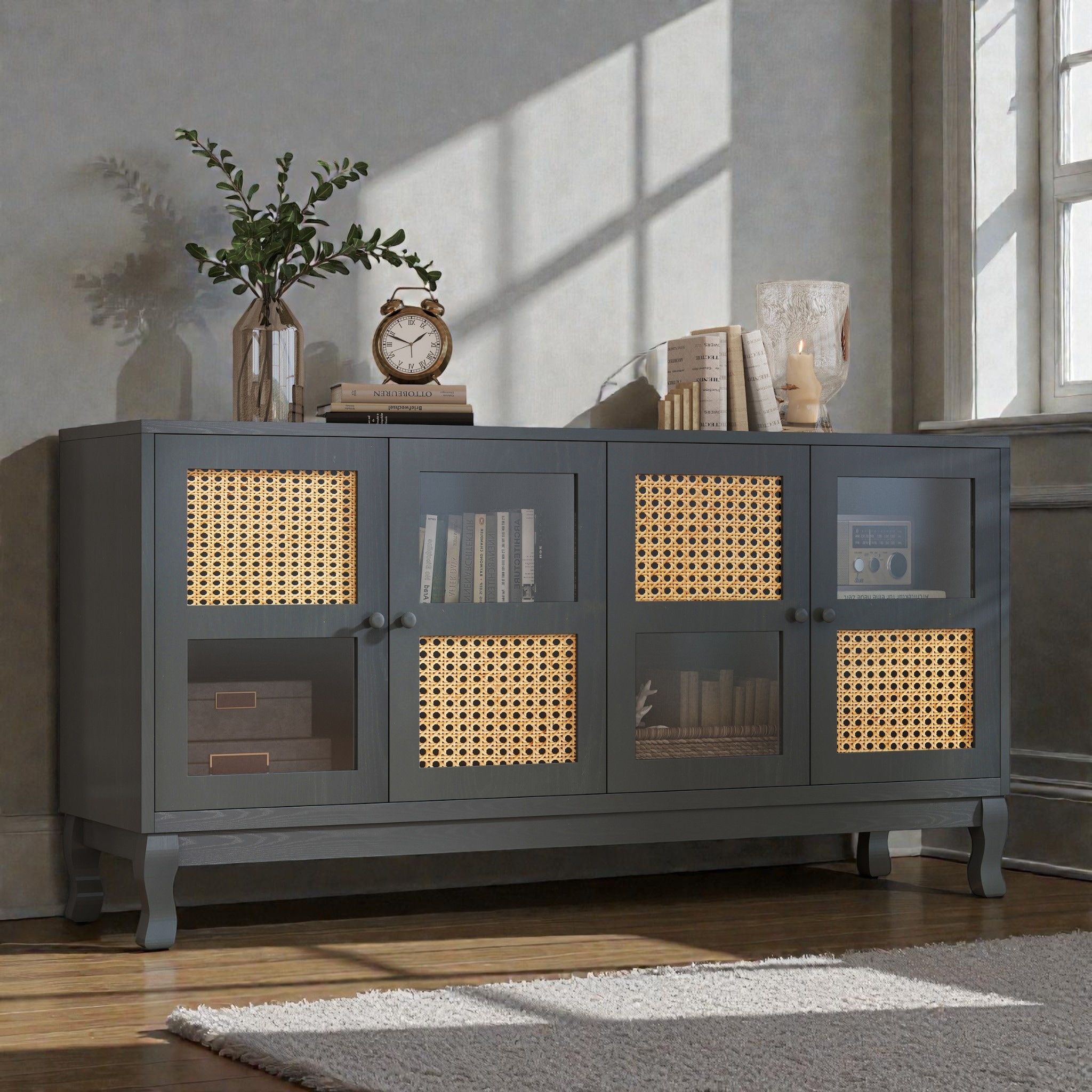 4-Door Buffet Sideboard Cabinet with Rattan and Glass Doors, Storage Cabinet, Console Cabinet for Dining Room Living Room
