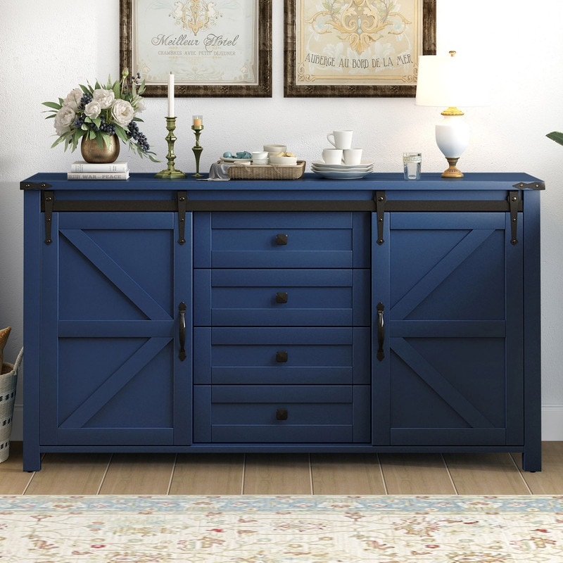 Farmhouse 55.1" Sideboard with Sliding Barn Doors and Storage Drawers, Wood Buffet Table with Power Outlet