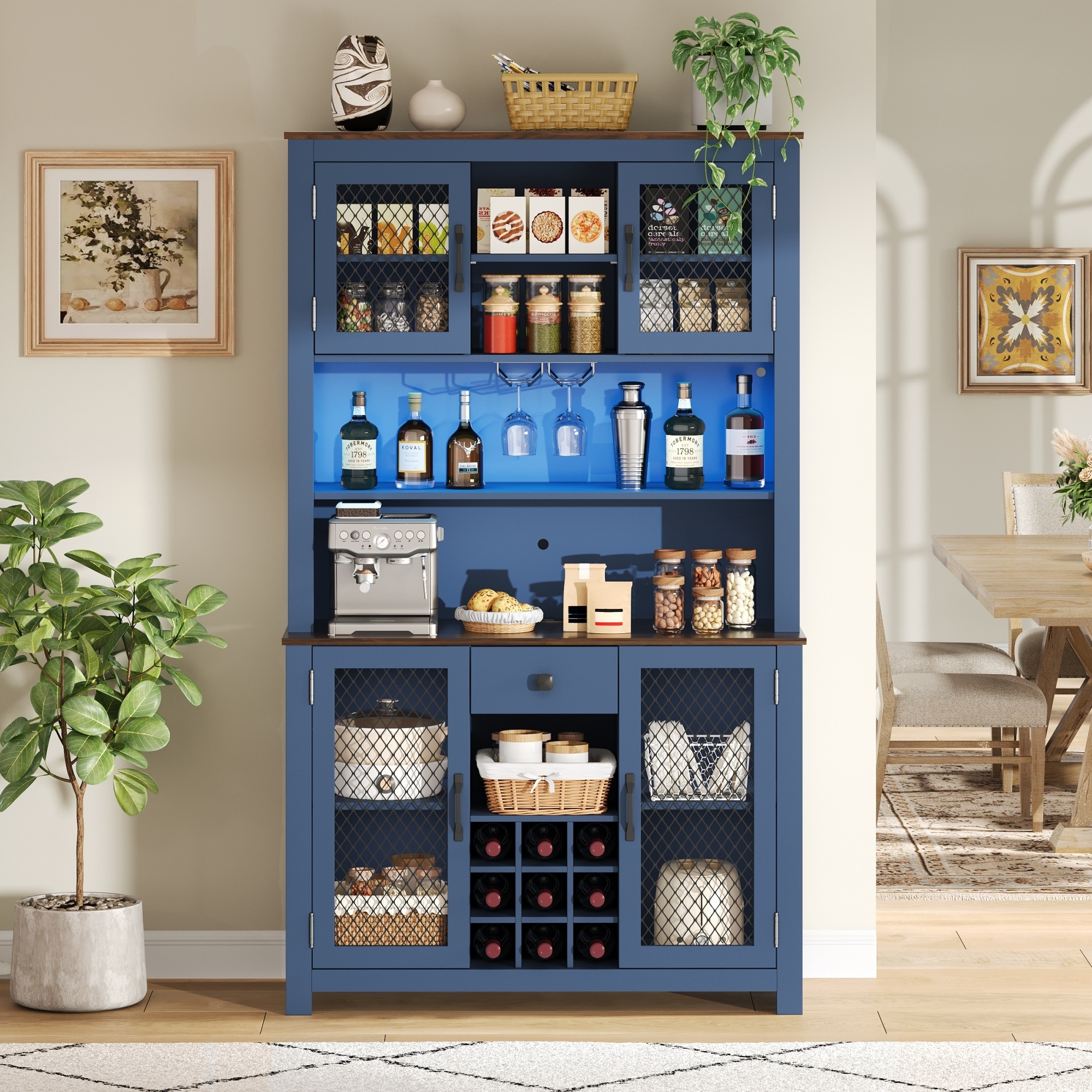 71" Pantry Cabinet, Coffee Bar Storage Cabinet with Charging Station & LED Lights, Tall Kitchen Hutch Cabinet with Wine Rack