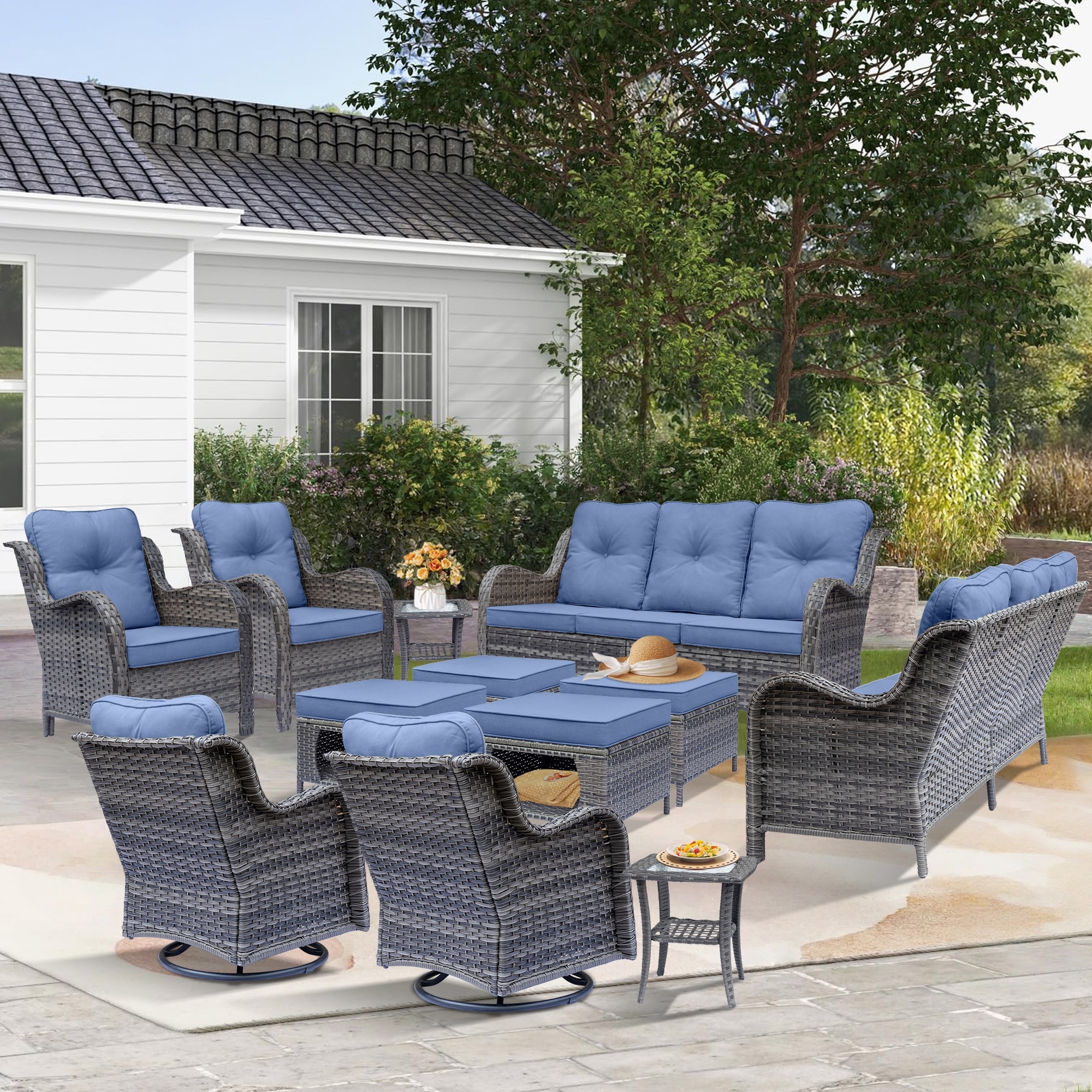 Gray Wicker Outdoor Patio Furniture Set with Swivel Rocker Patio Chairs