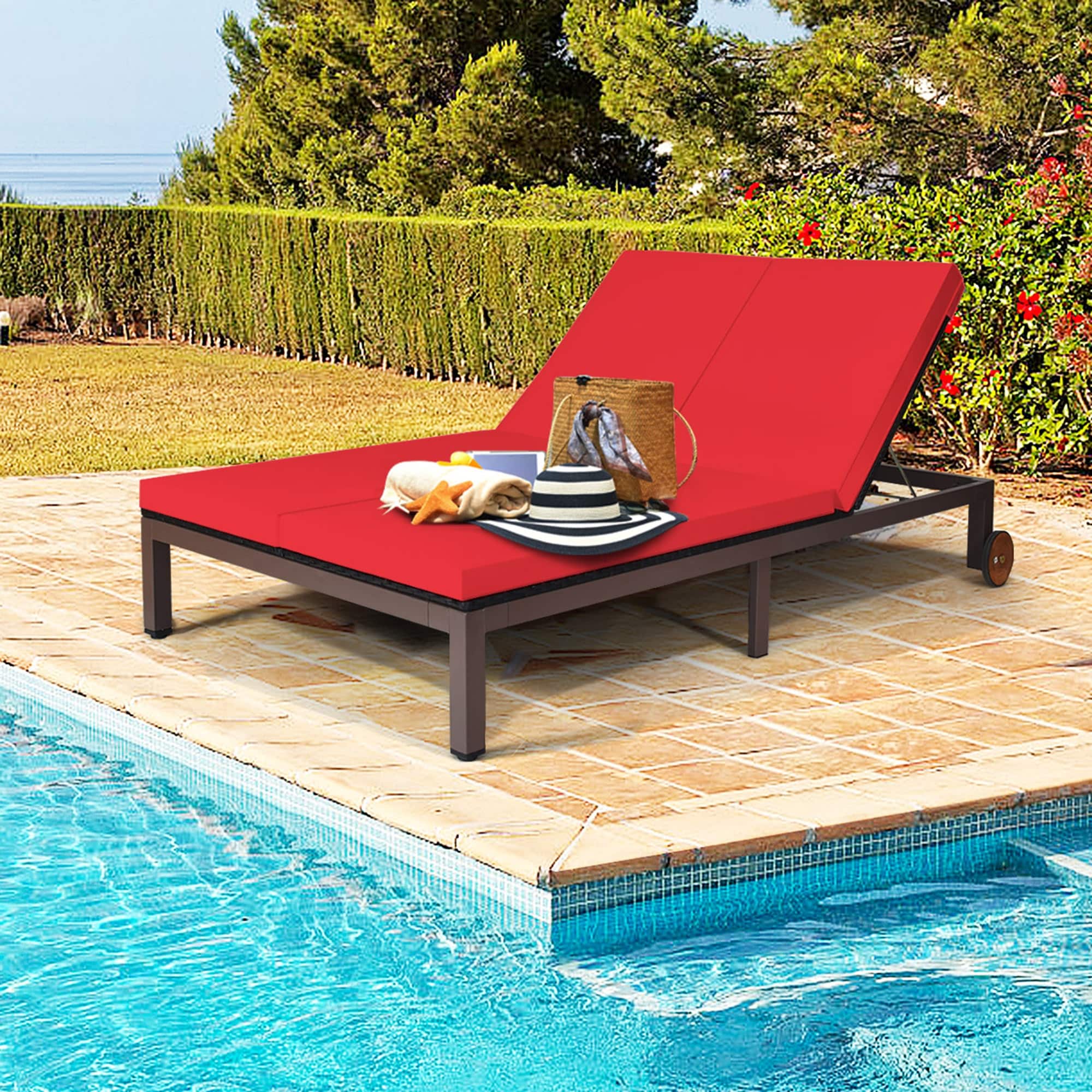Gymax Adjustable Patio Rattan 2 Person Recliner Lounge Chair w/ Red