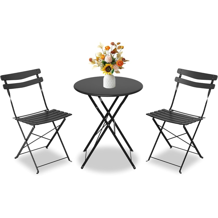 3 Piece Folding Patio Bistro Set, Metal Table & Chairs, Outdoor Indoor Balcony Garden, Black