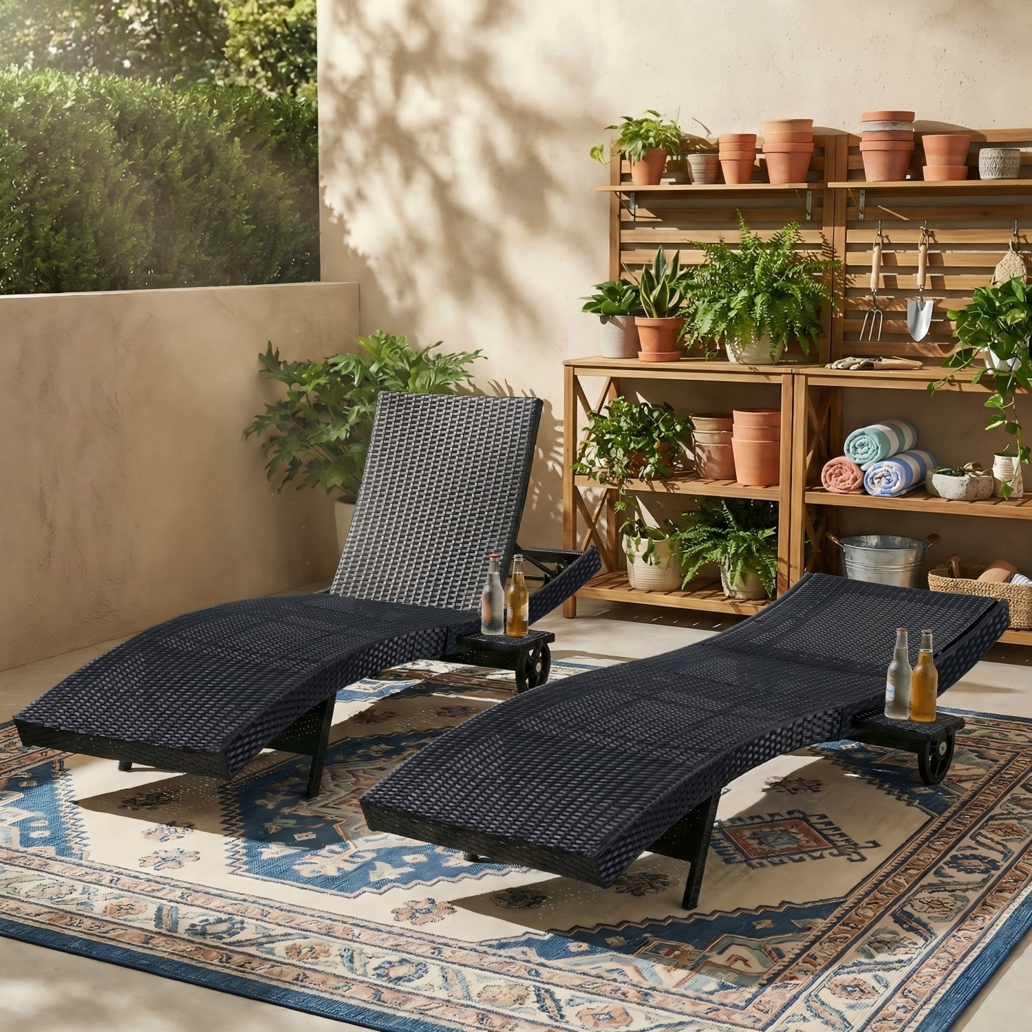 80" Patio Wicker Chaise Lounge Chairs with Rolling Wheels & Pull-out Side Table,Set of 2