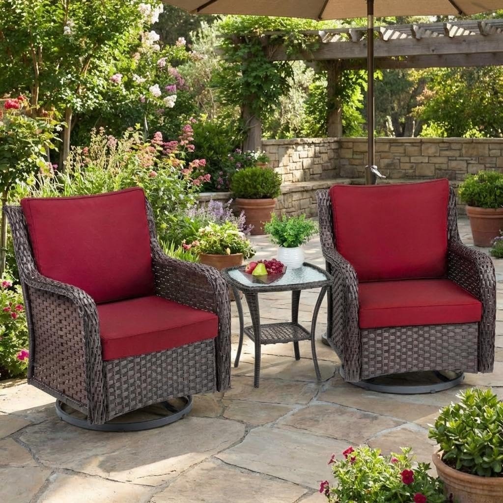 3 Piece Outdoor Swivel Wicker Glider Chair Set, 4" Cushions & 2 Tier Coffee Table, Patio Bistro Set