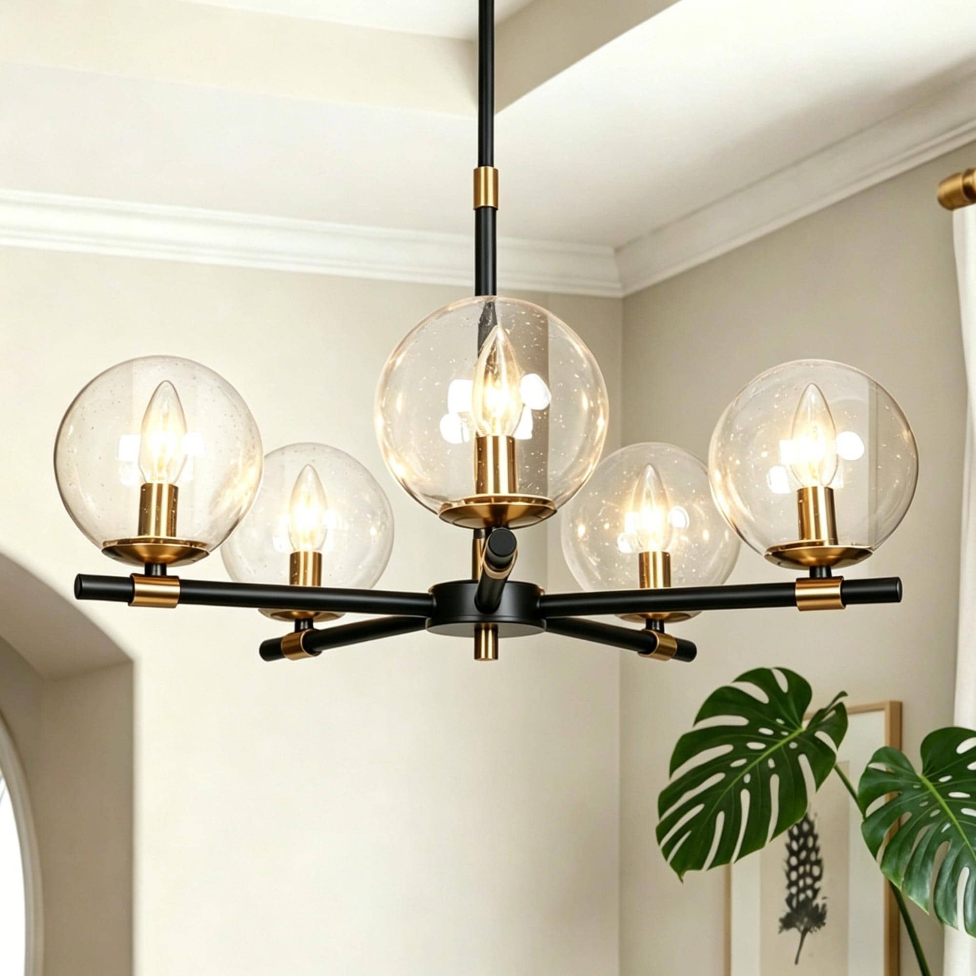 Modern 5-Light Black Gold Wheel Chandelier Globe Glass Pendant Lights for Dining Room - 22" D x 14" H