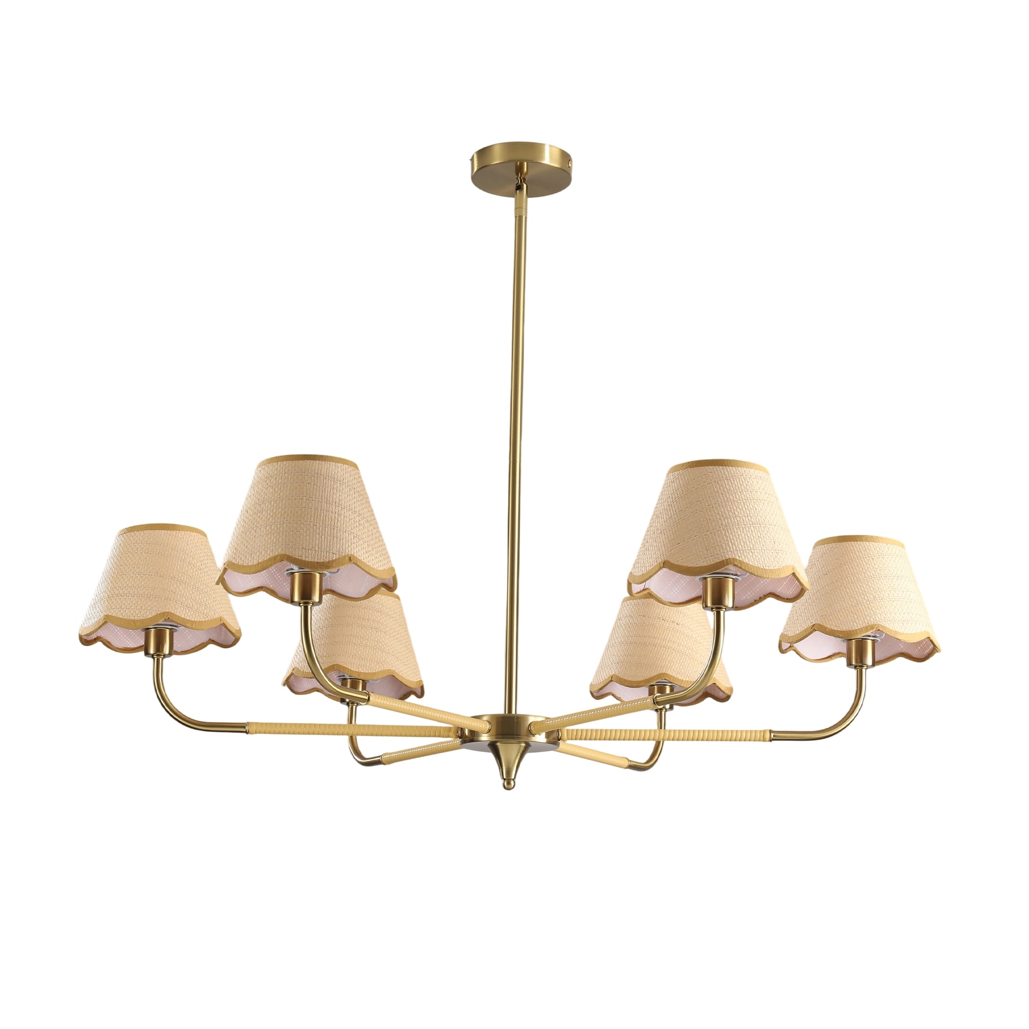 Medieval-Style Gold 6-Lamp Chandelier with Hand-Woven Rattan Lampshade, for Dining Room, Living Room, Light Bulbs Not Included
