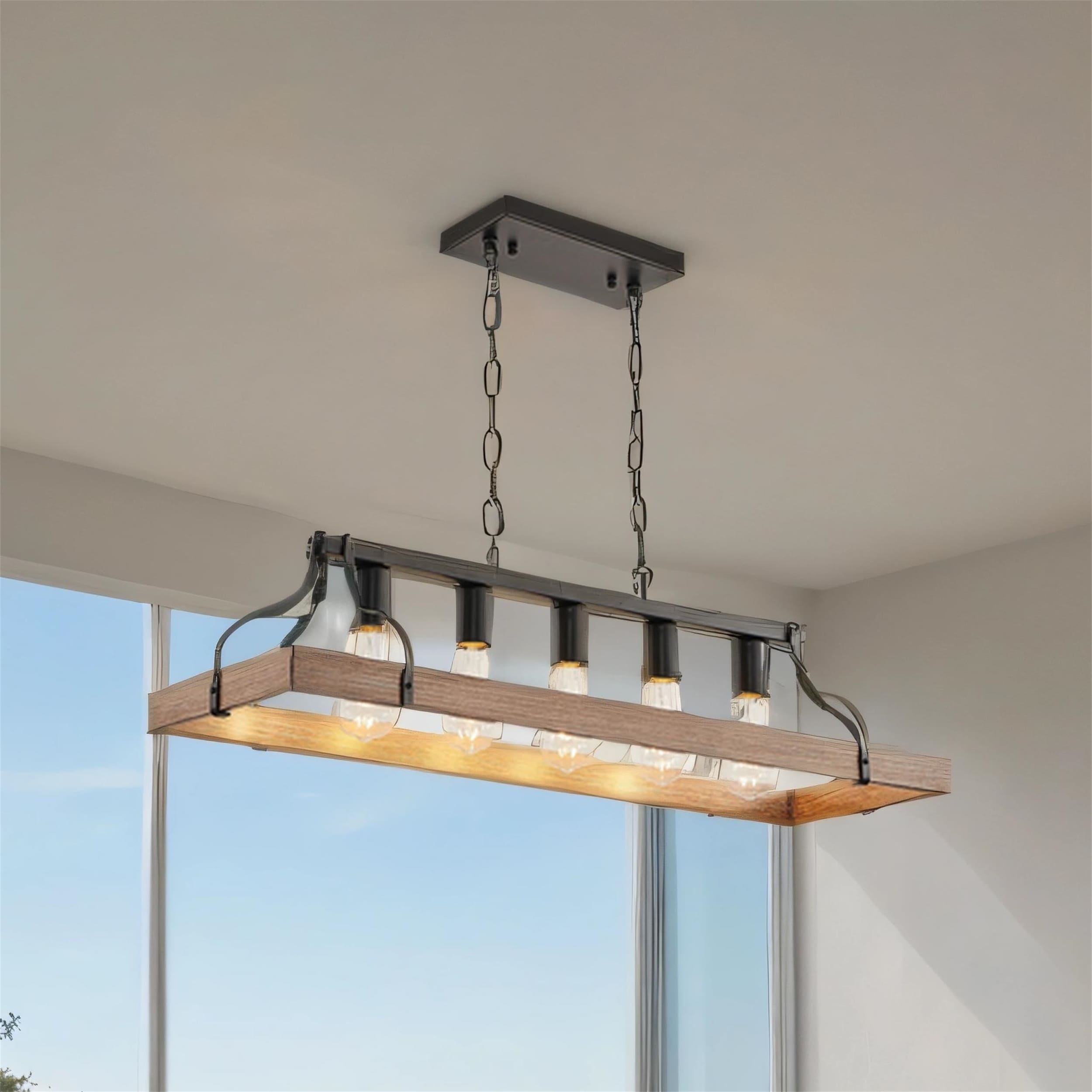 5-Light Black & Walnut Pendant - Adjustable Farmhouse Chandelier