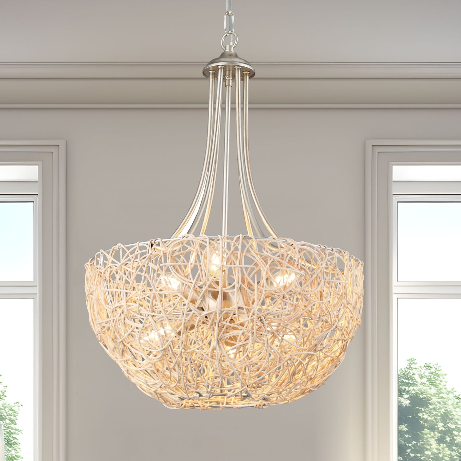 LZ344-6 6 Light Chandelier iron frame in antique silver finish,beige rattan - 25.2"H x 17.7'W x 17.7"D