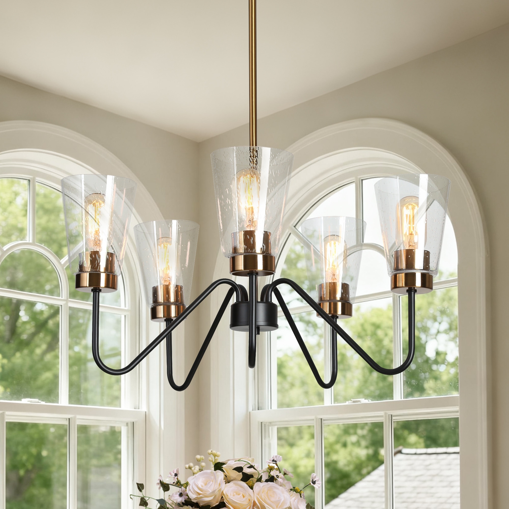 Ivelle Modern 5-Light Black Gold Wheel Chandelier Seeded Glass Pendant Lights for Dining Room - 22 “