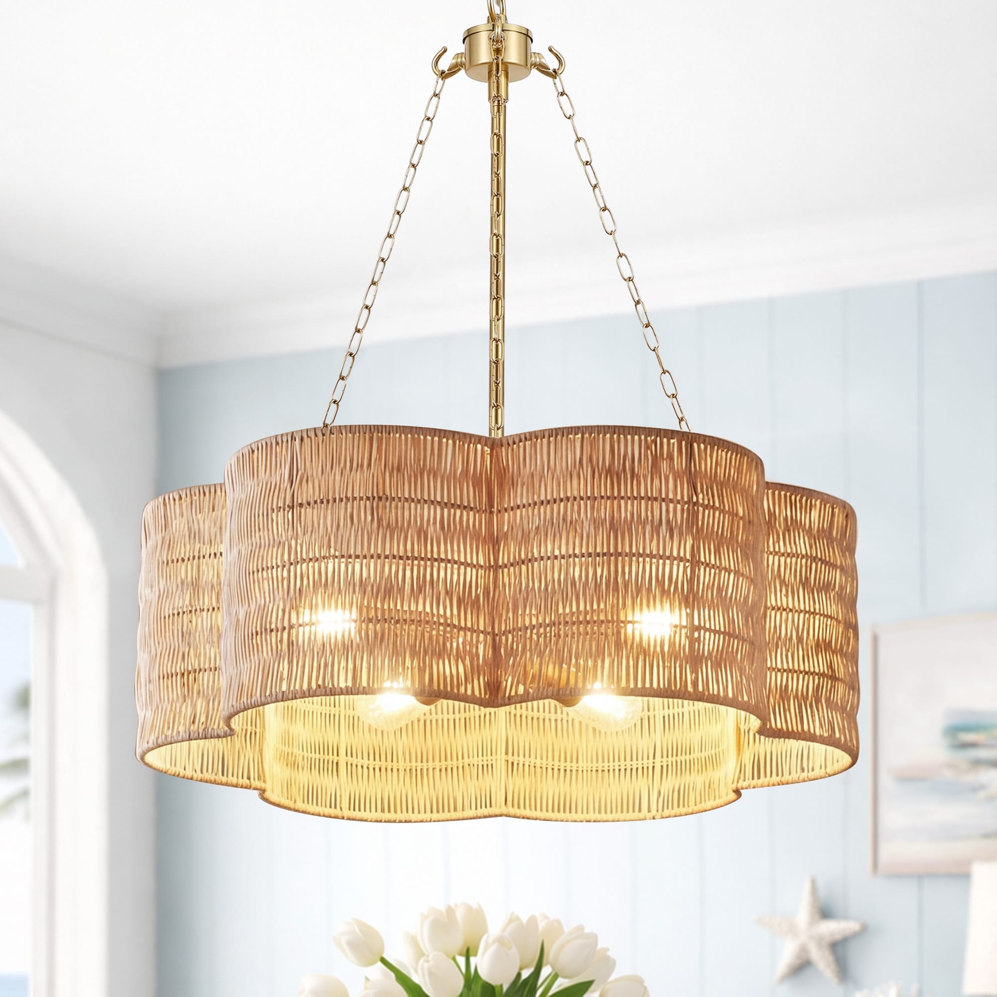 20" Coastal Boho 4-Light Scalloped Rattan Drum Chandelier