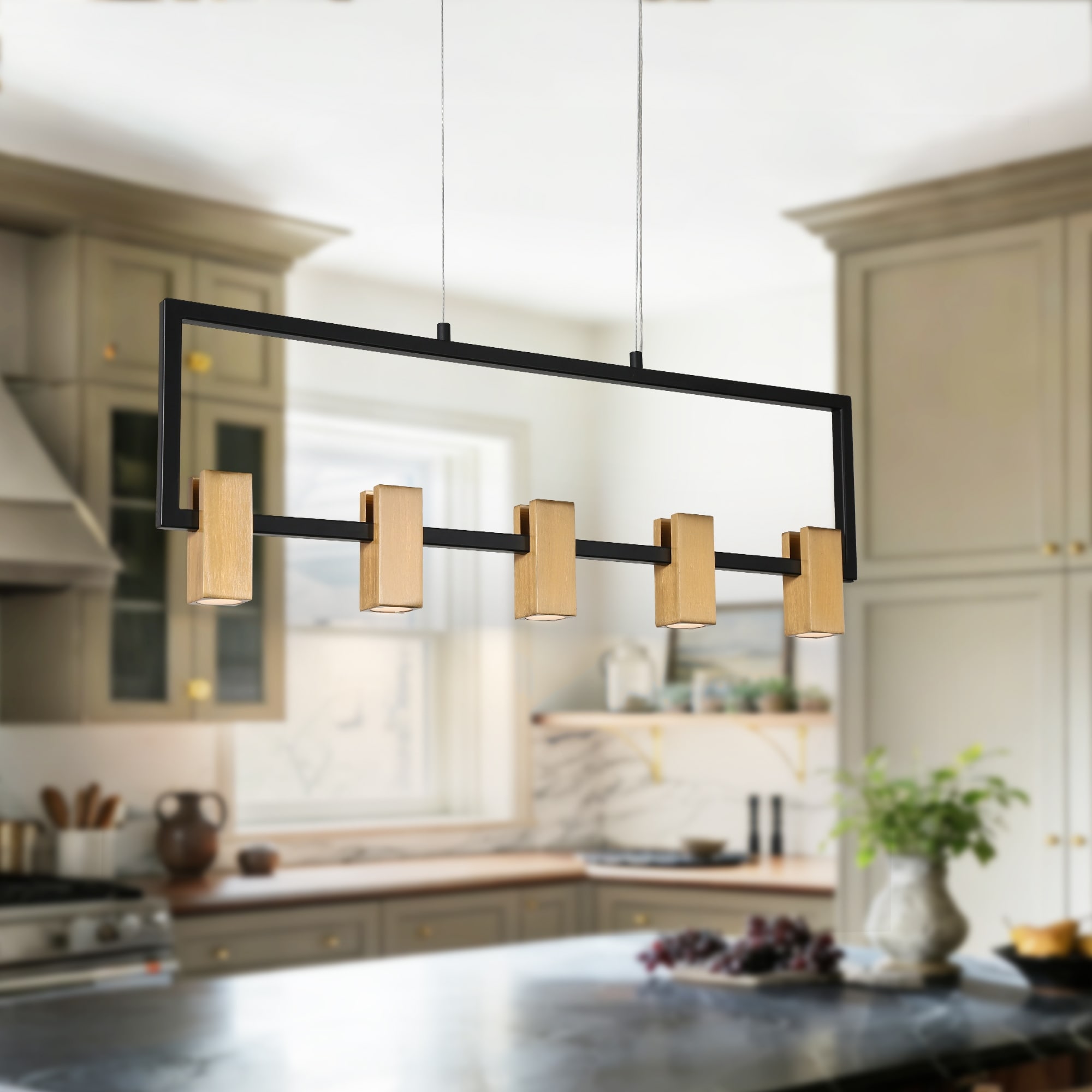 Farmsy Modern Farmhouse Linear Faux Wood Metal Chandelier Glass Adjustable Kitchen Island Pendant for Dining Room