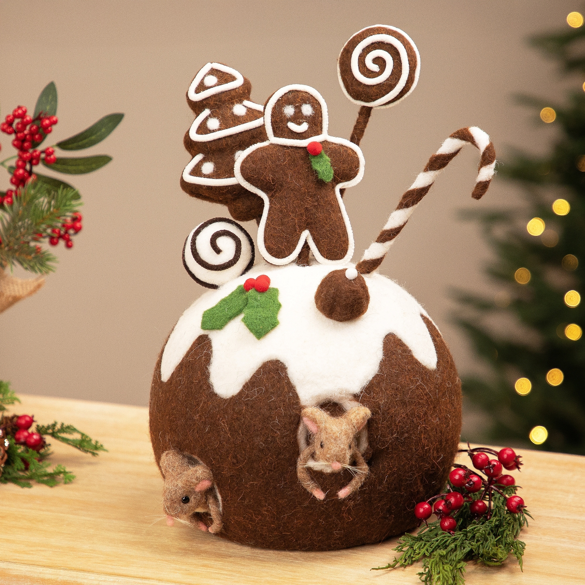 Gingerbread Cake and Mice Christmas Decoration - 13" - Brown and White