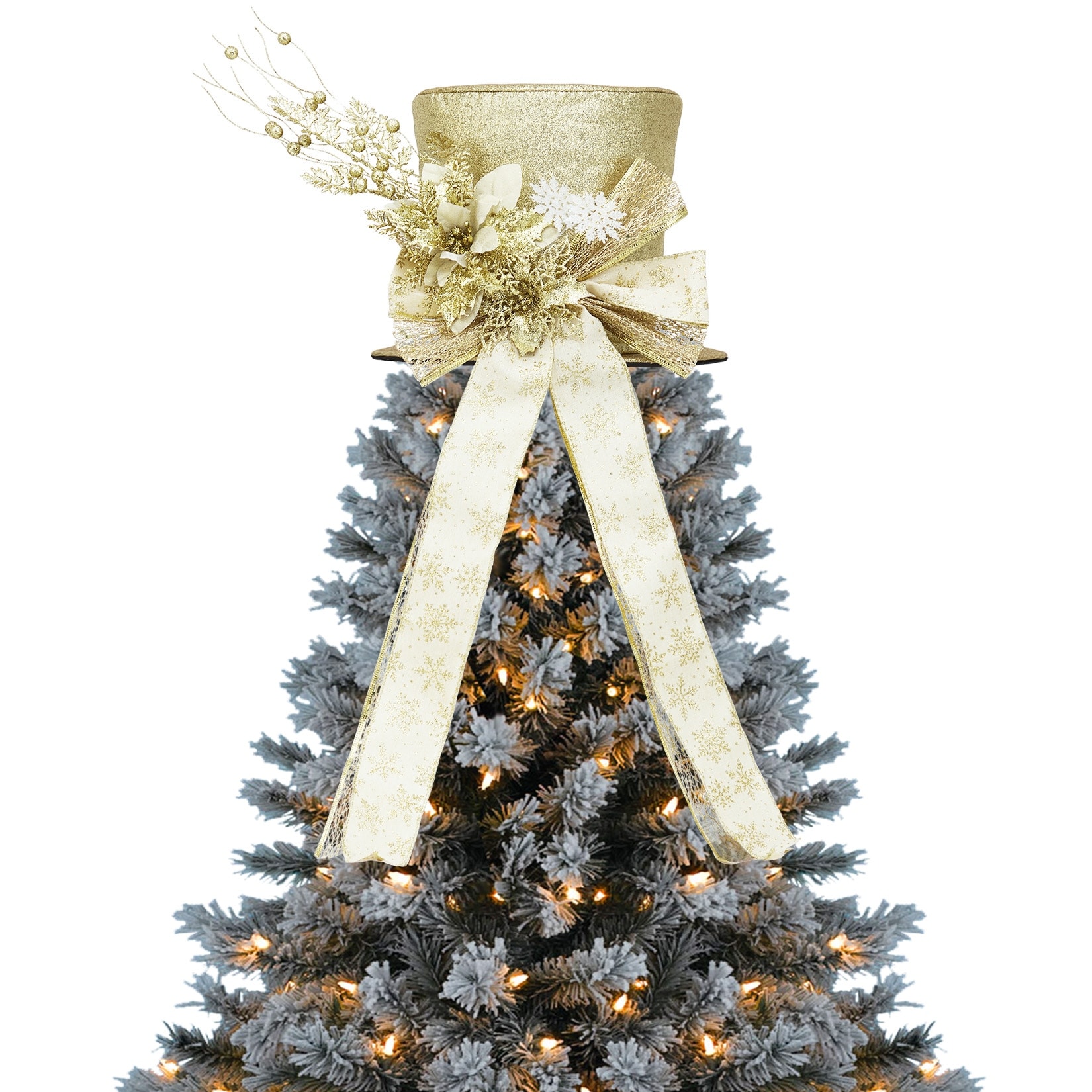 Sparkling Champagne Gold Santa Hat Tree Topper with Bow & Snowflakes - 25cm Festive Decor for Xmas Tree & Tabletop.