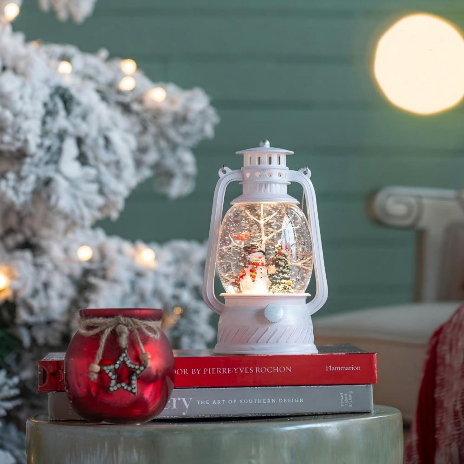 4.7x4.7x8.3"H Christmas Plastic Resin White Lantern with Snowman and Tree Led