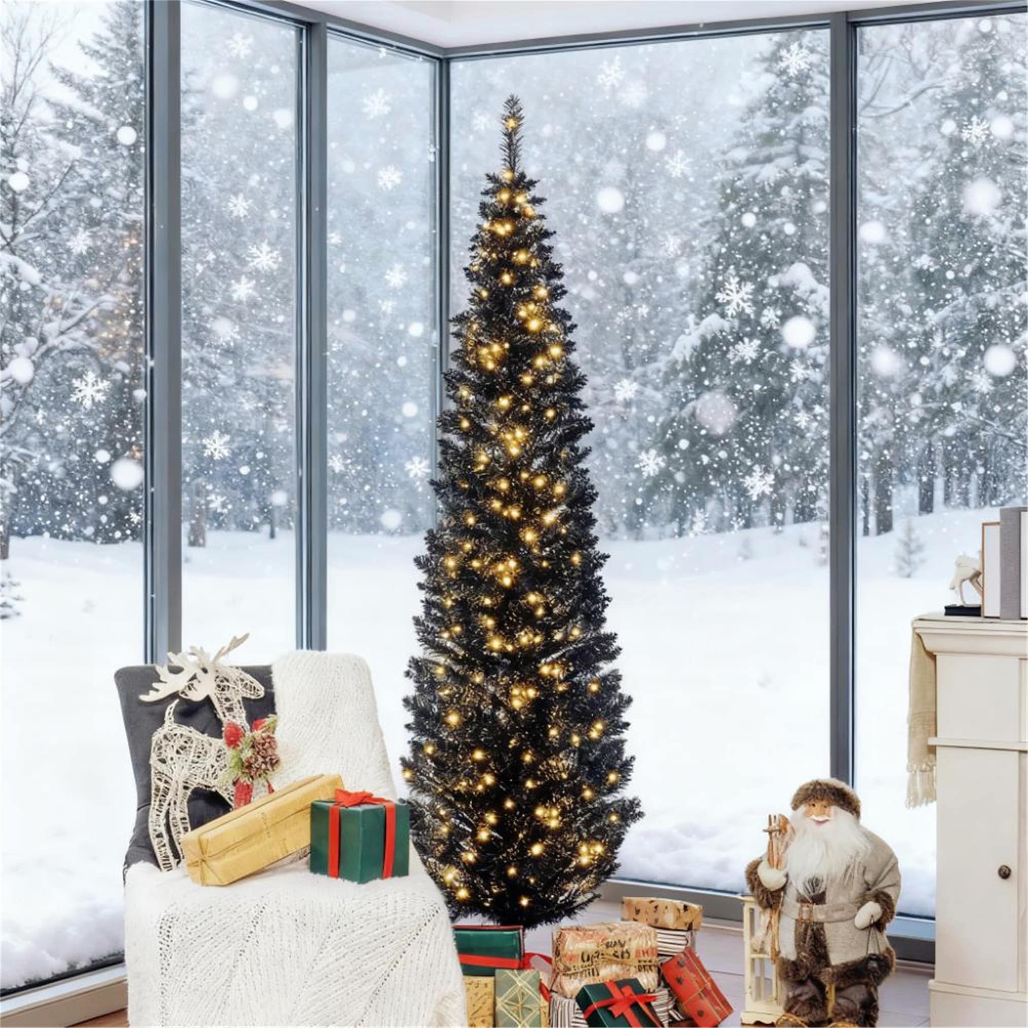 7ft Slim Pencil Christmas Tree with Warm White LED Lights and Flame-Retardant Design for Cozy Indoor Holiday Decor.