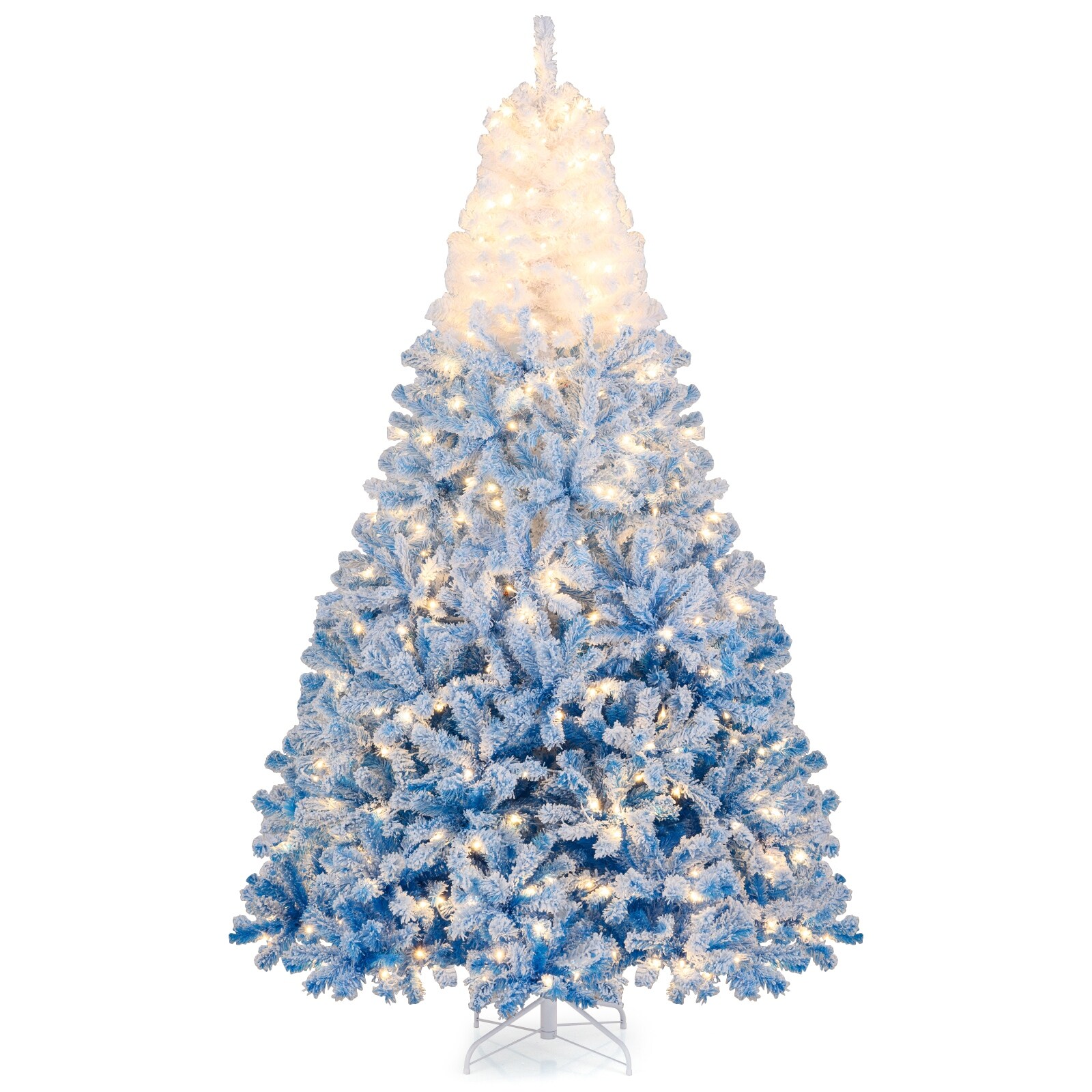 Gymax 5/6/7/8 FT Artificial Christmas Tree Hinged Snow Flocked Xmas - Blue, White