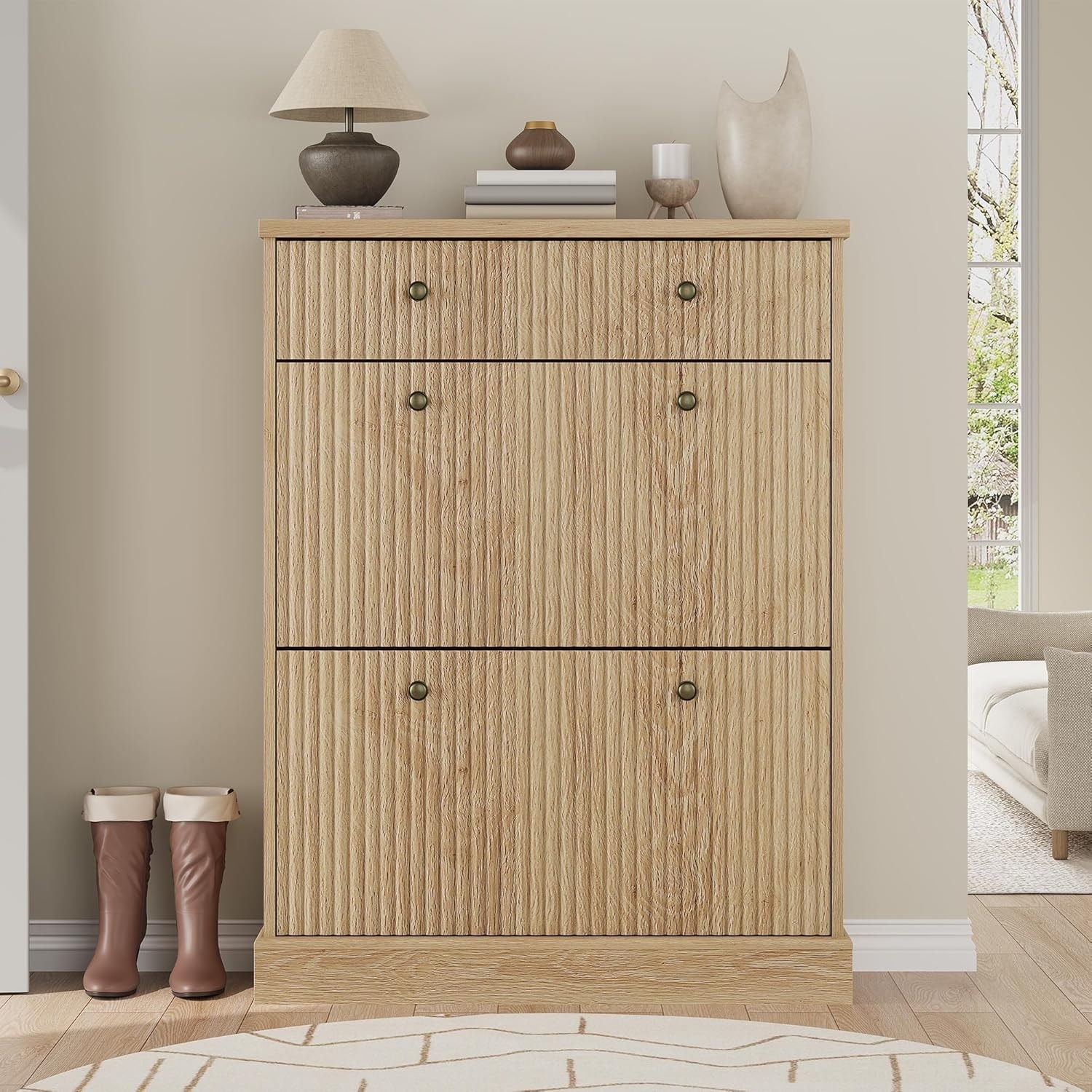 Fluted Shoe Storage Cabinet with 2 Flip Drawers & Top Drawer, 42" Tall Narrow Shoe Organizer, Curved Profile Design