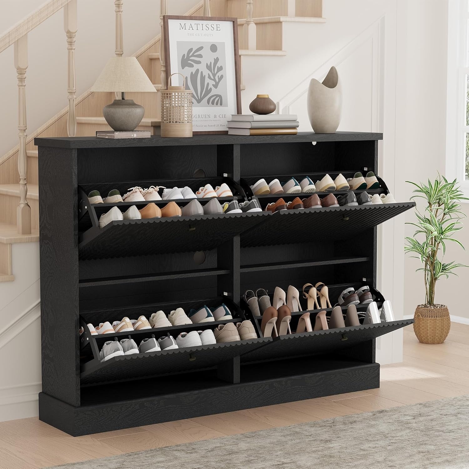 Fluted Shoe Cabinet Storage with 4 Flip Drawers, Fluted Narrow Shoe Organizer with Adjustable and Removable Shelves