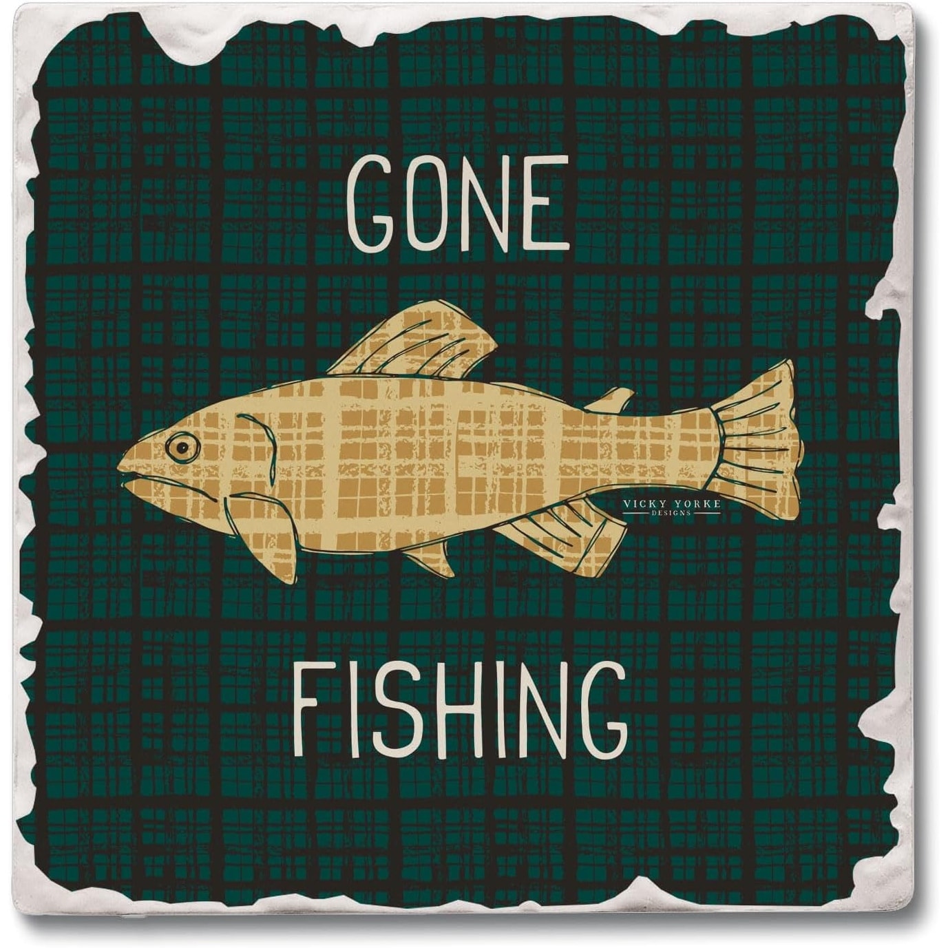 Gone Fishing 4 Pack Tumbled Tile Stone Coaster with Protective Cork Backing Made in The USA 4" Square, Artistic, Wipes Clean