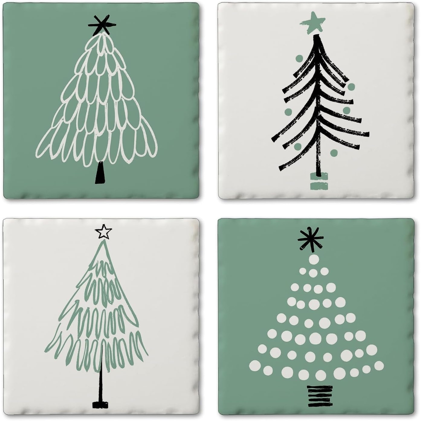 Scandinavian Holiday Trees 4-Pack Assorted Tumbled Tile Stone Coasters with Protective Cork Backing Manufactured in The USA