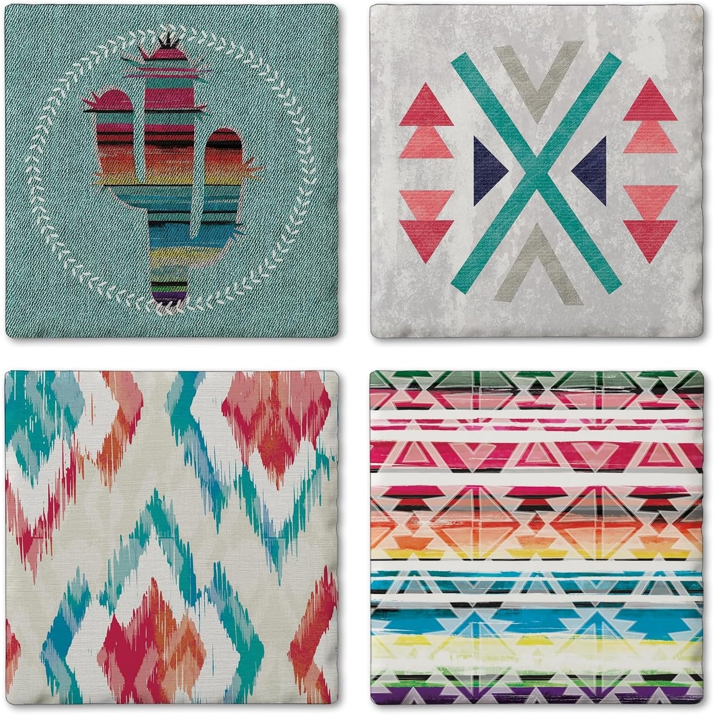 Assorted Rug Designs 4-Pack Stone Coasters with Protective Cork Backing Made in The USA Absorbent Easily Wipes Clean