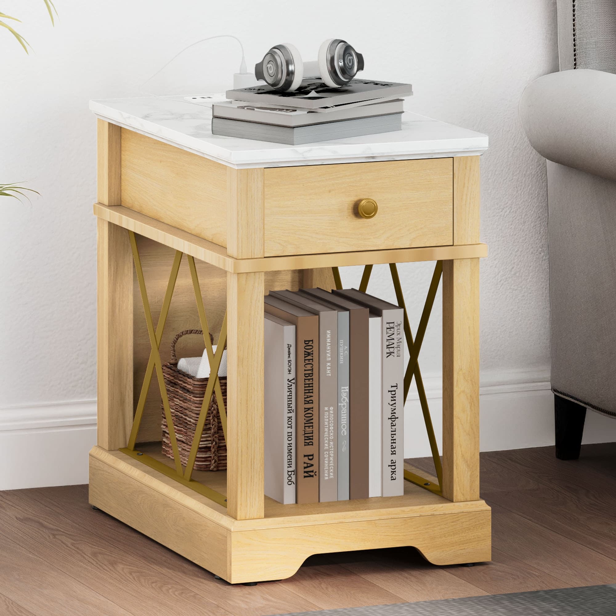 Moasis Farmhouse Wood End Table with Drawer Power Outlets, Chairside Sofa Side Table w/Storage Shelf