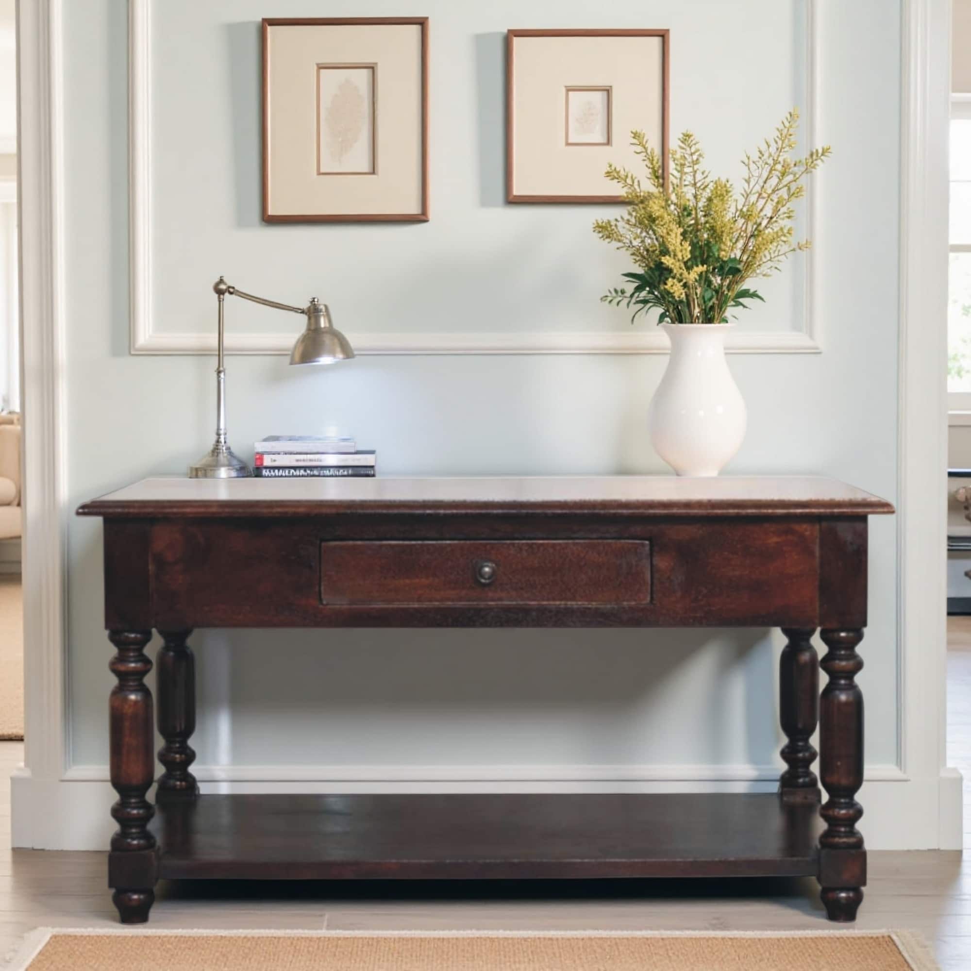 33.5" Solid Mango Wood Console Table with Turned Legs, 2 Drawers & Shelf