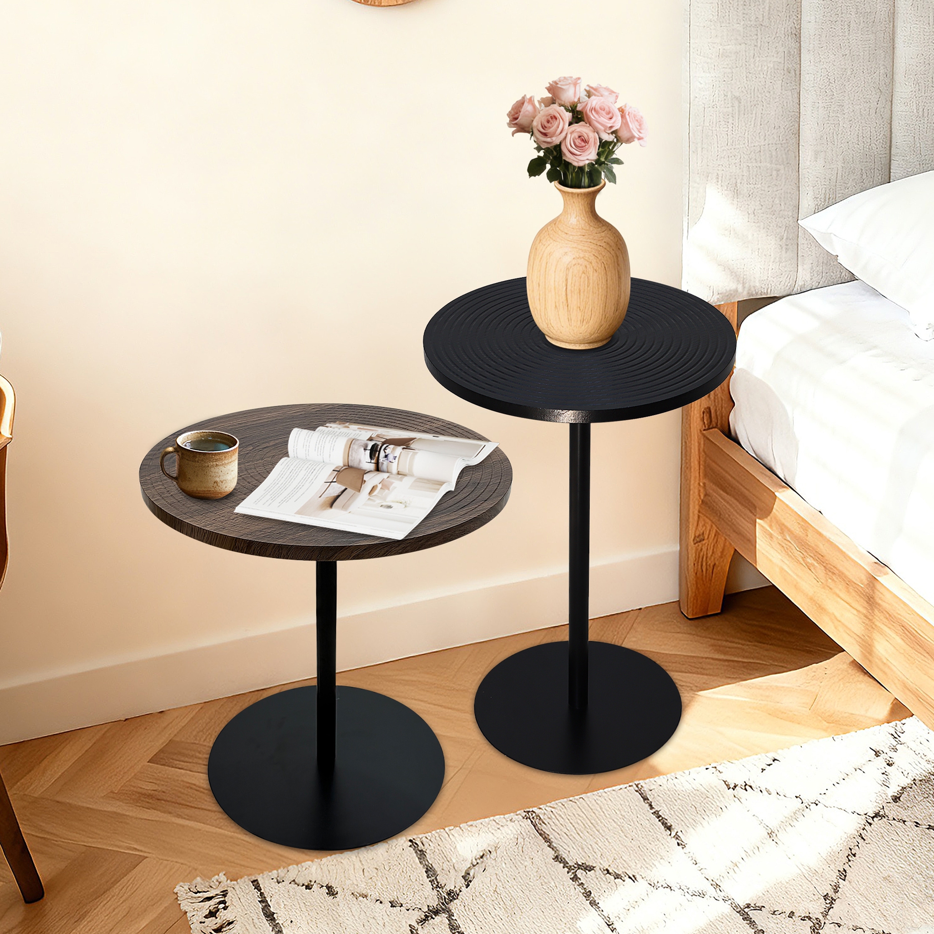 Set of 2 Small Round Side Tables with Wood Tabletop and Metal Pedestal, Walnut Brown & Black - 13.78×20.87''