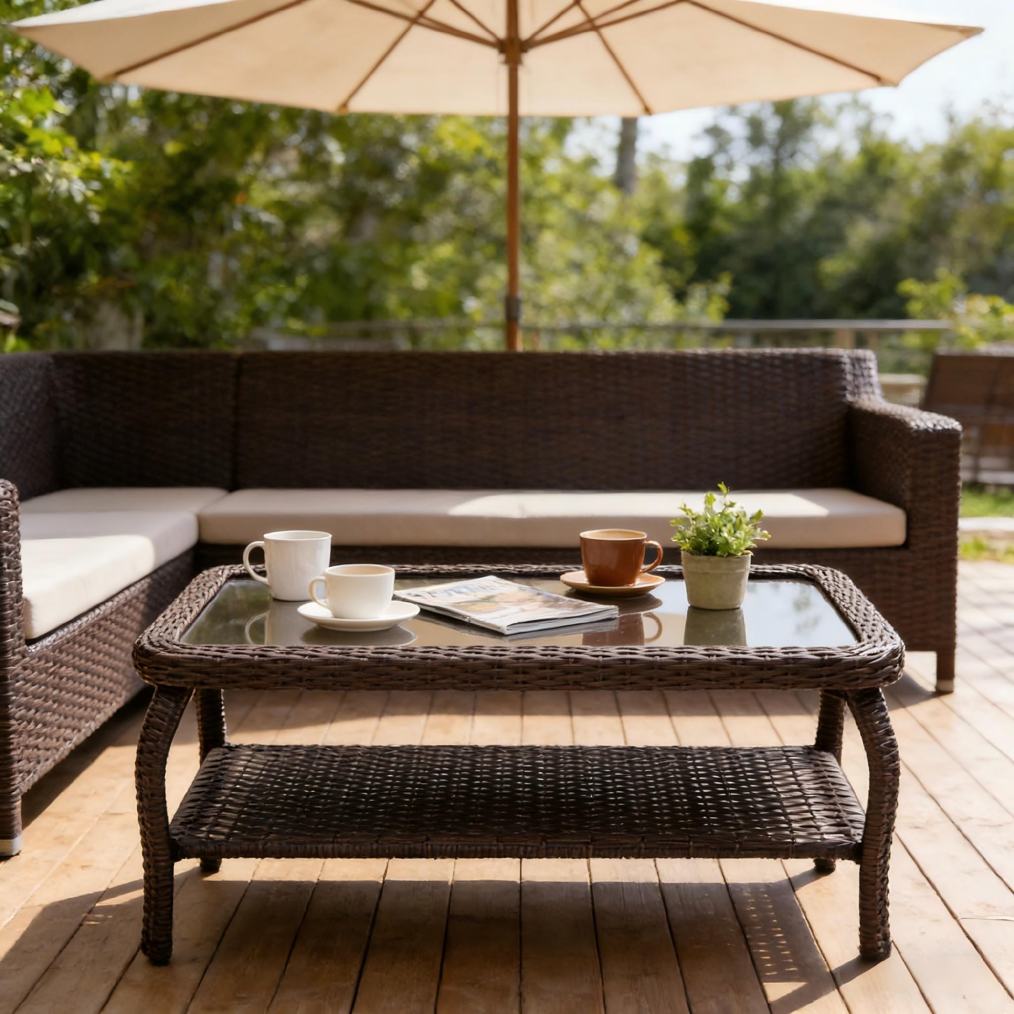 Outdoor Wicker Coffee Table, Brown Rattan Frame with Tempered Glass Top Side Table