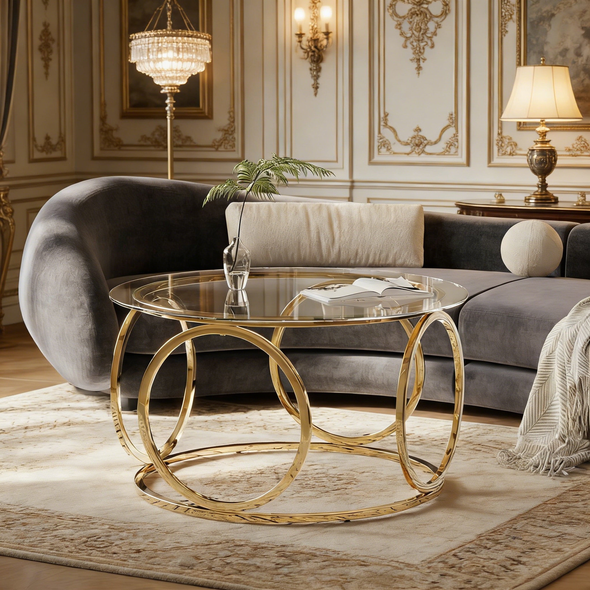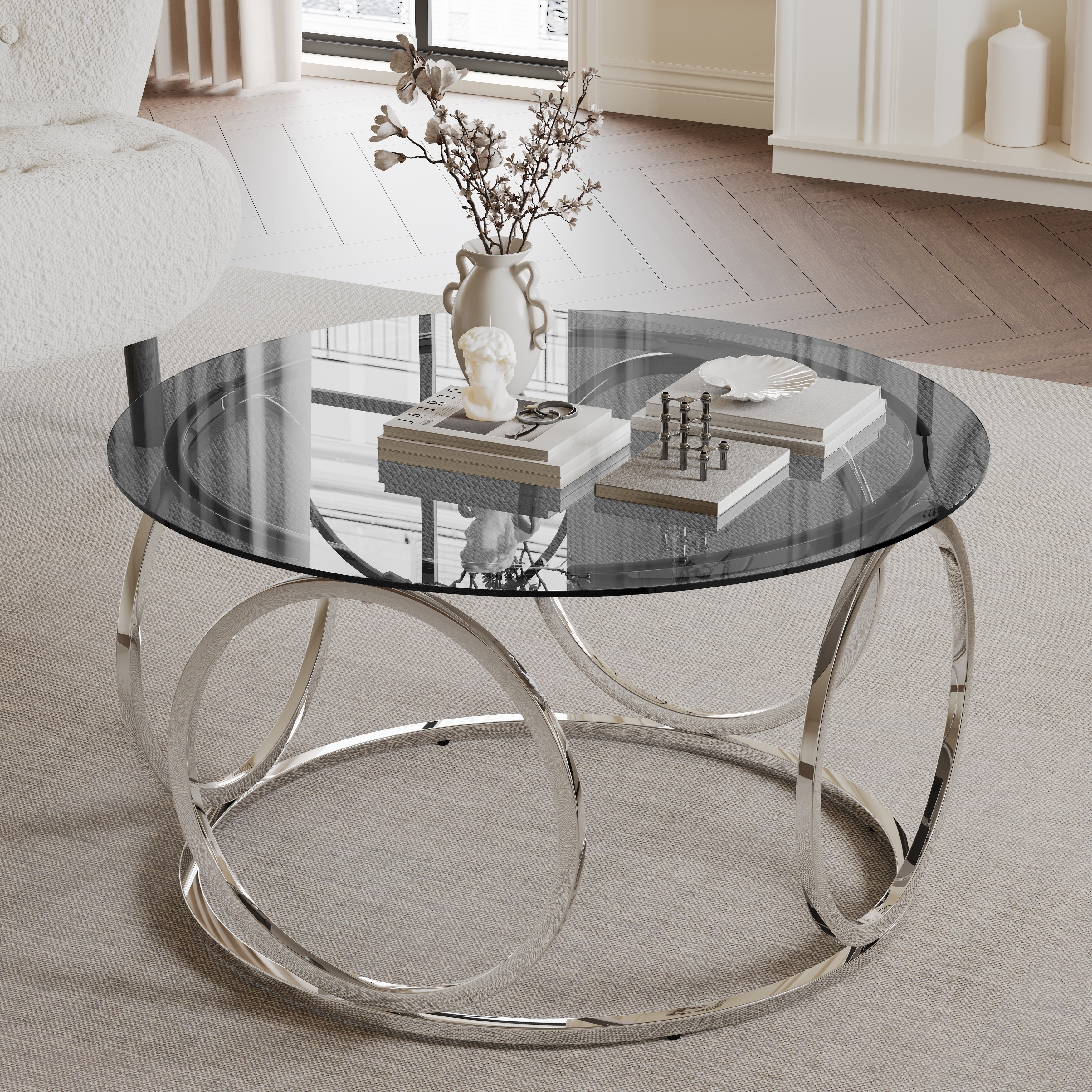31.5" Modern Round Glass Top Coffee Table with Circular Metal Frame