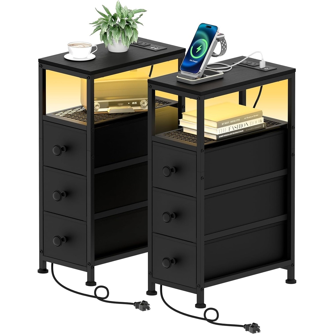 Slim End Table Set with Charging Station, LED Light, and 3 Fabric Drawers for Bedroom, Black