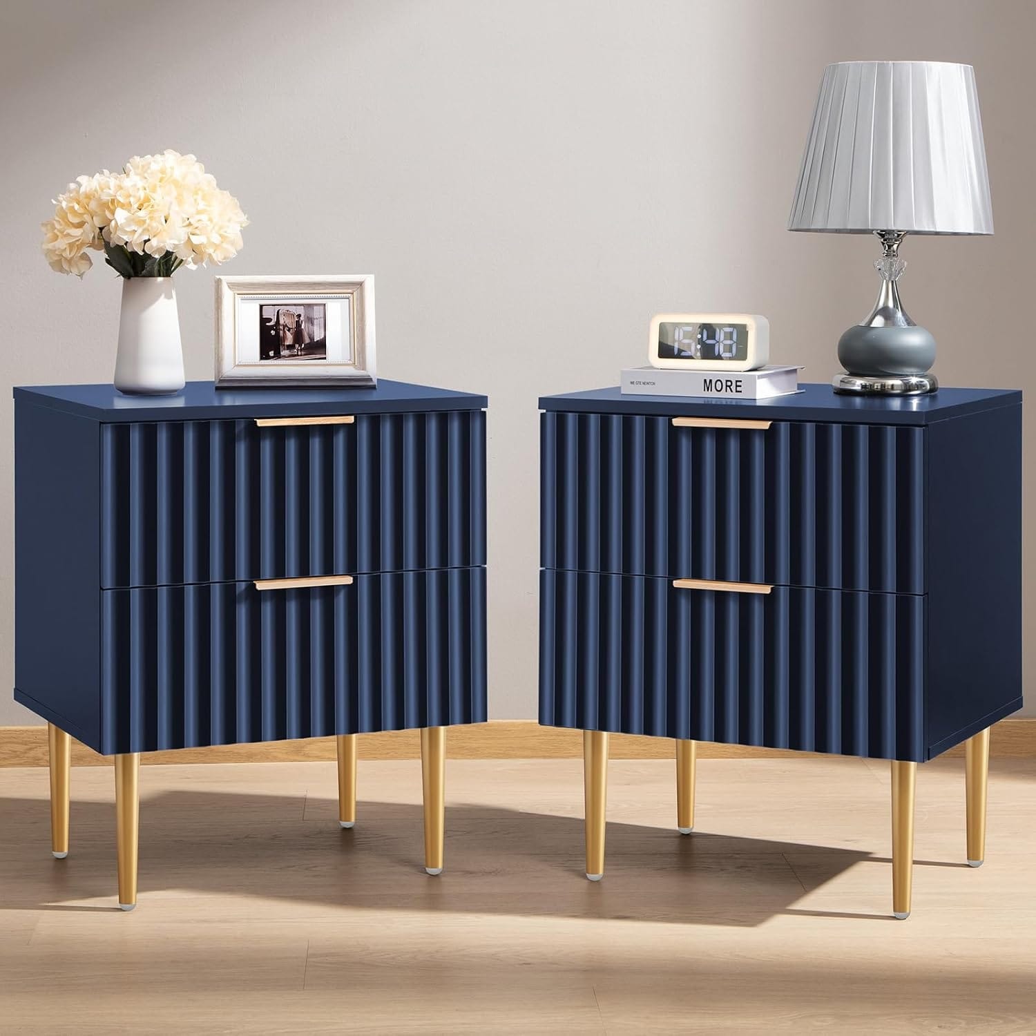 Fluted Glossy Nightstand Set of 2, 2-Drawer Wide Bedside Table with Golden Metal Legs (Blue)