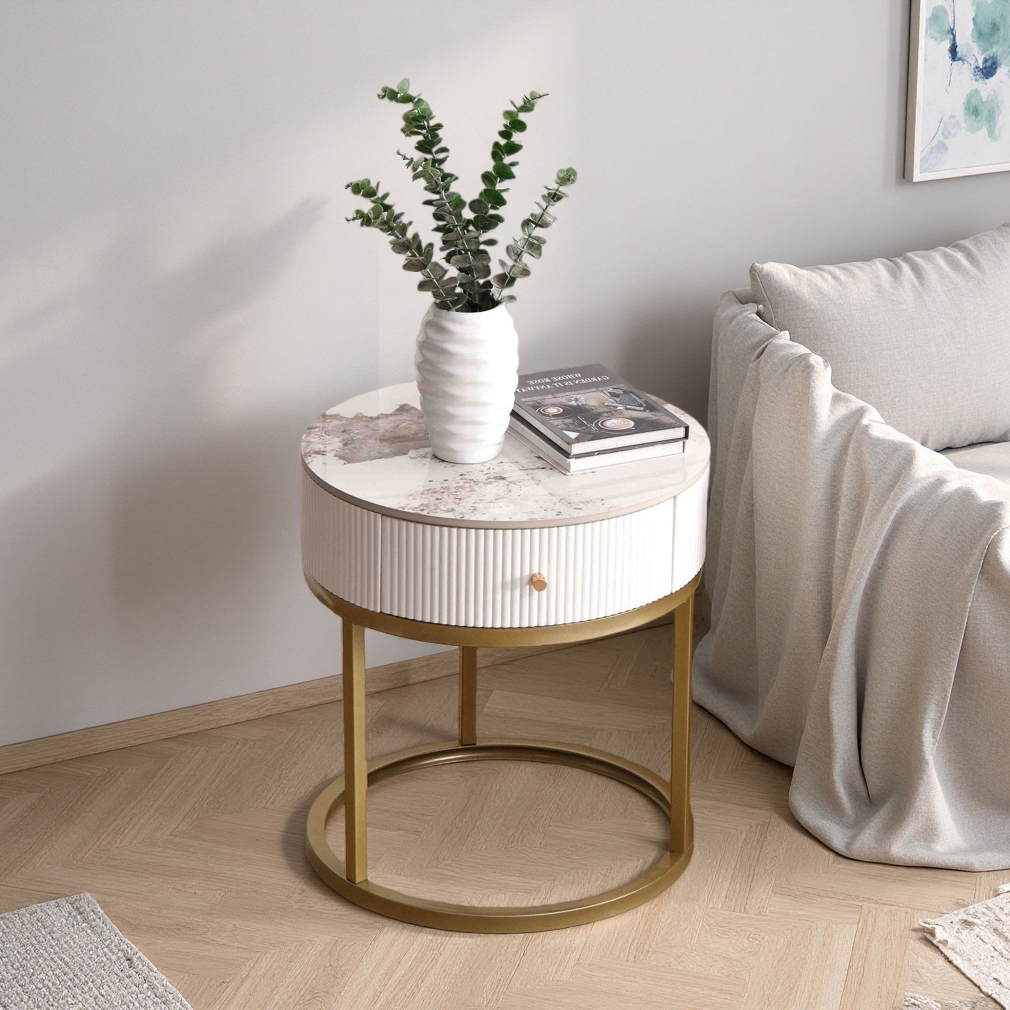 19.68" Sintered Stone Round Modern Side Table with Drawer and Sturdy Construction