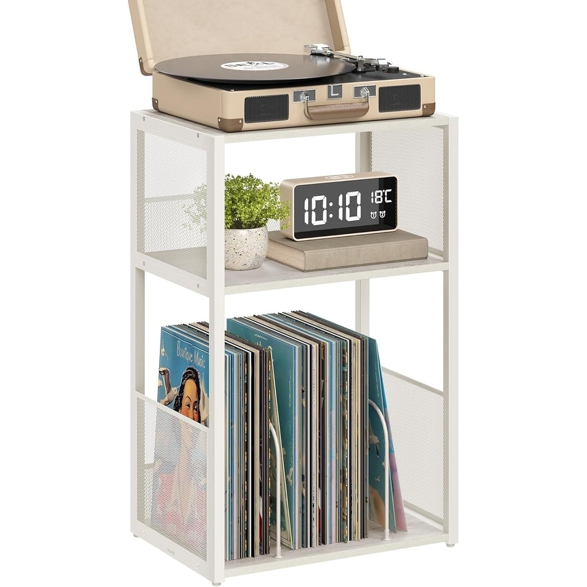 Record Player Stand, 3-Tier Side Table for Vinyl Storage (100 Albums), Rustic White