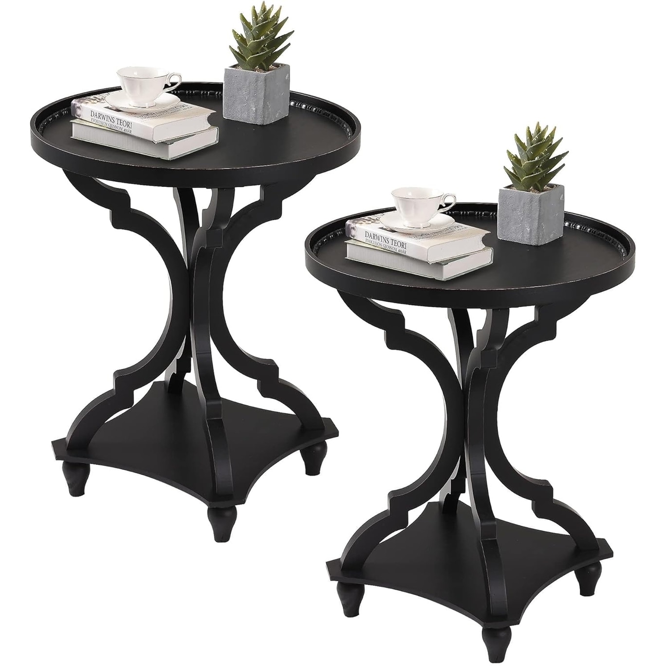 Rustic Round Wood Accent Table Set - Handcrafted Tray Top Nightstand for Living Room, Set of 2, Black