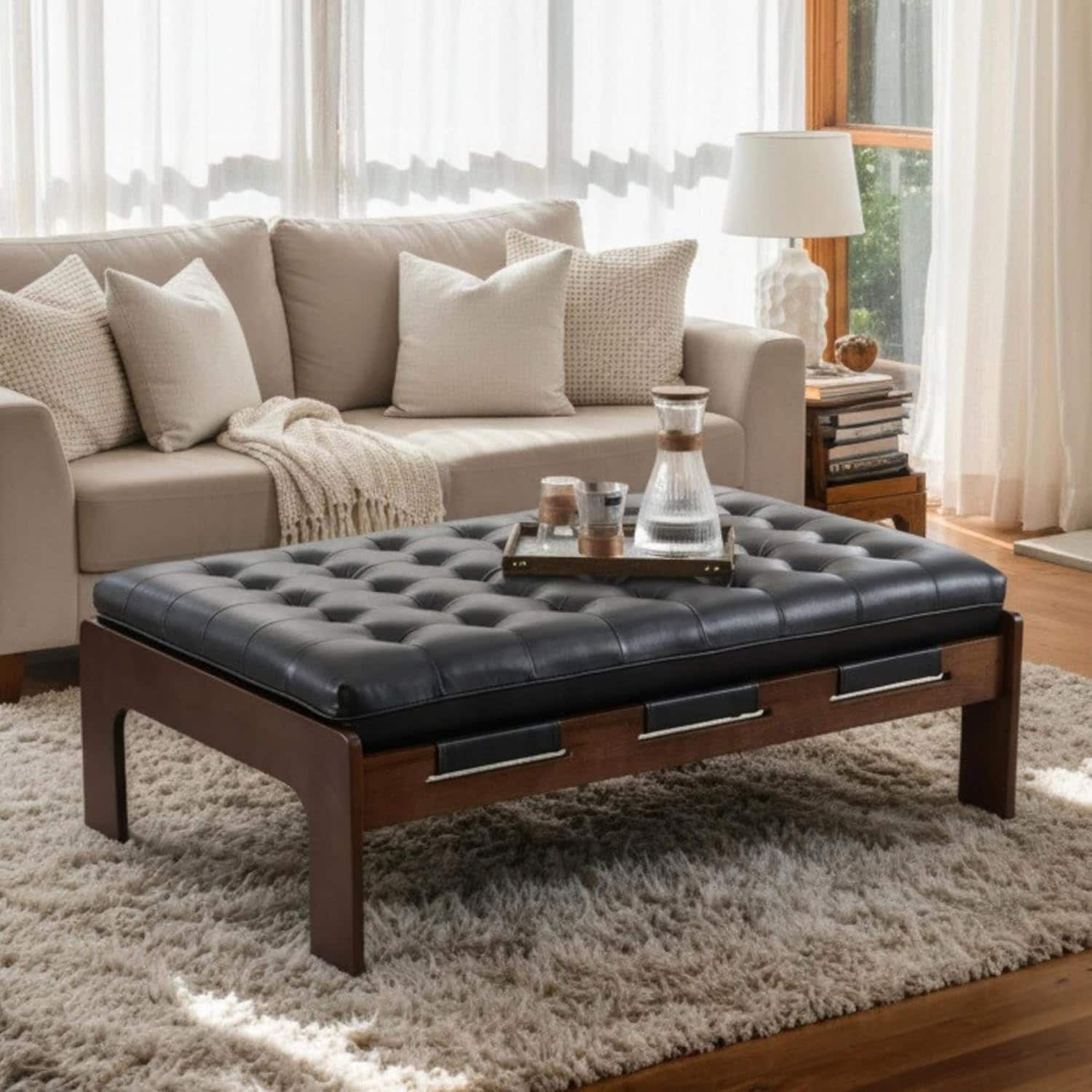 Coffee Table, 47.75'' Black Living Room Ottoman, Square Ottoman Bench Leather Tufted Upholstered Coffee Tables