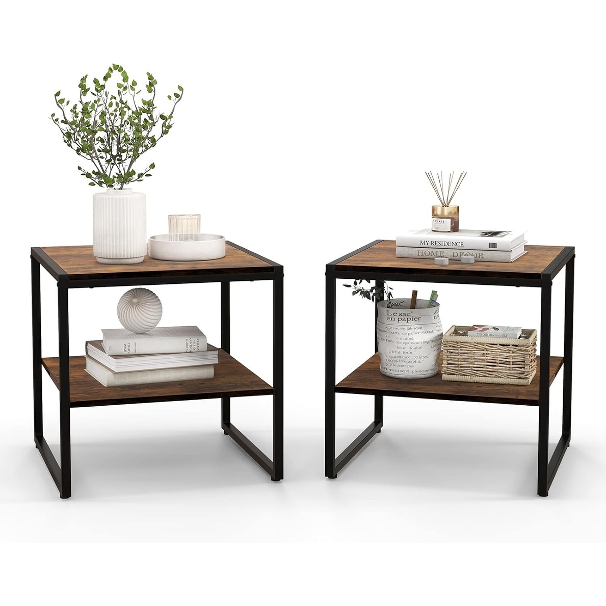 Set of 2 Industrial Side Tables with Open Shelf - Square Coffee Table with Heavy-Duty Metal Frame - Compact for Small Spaces