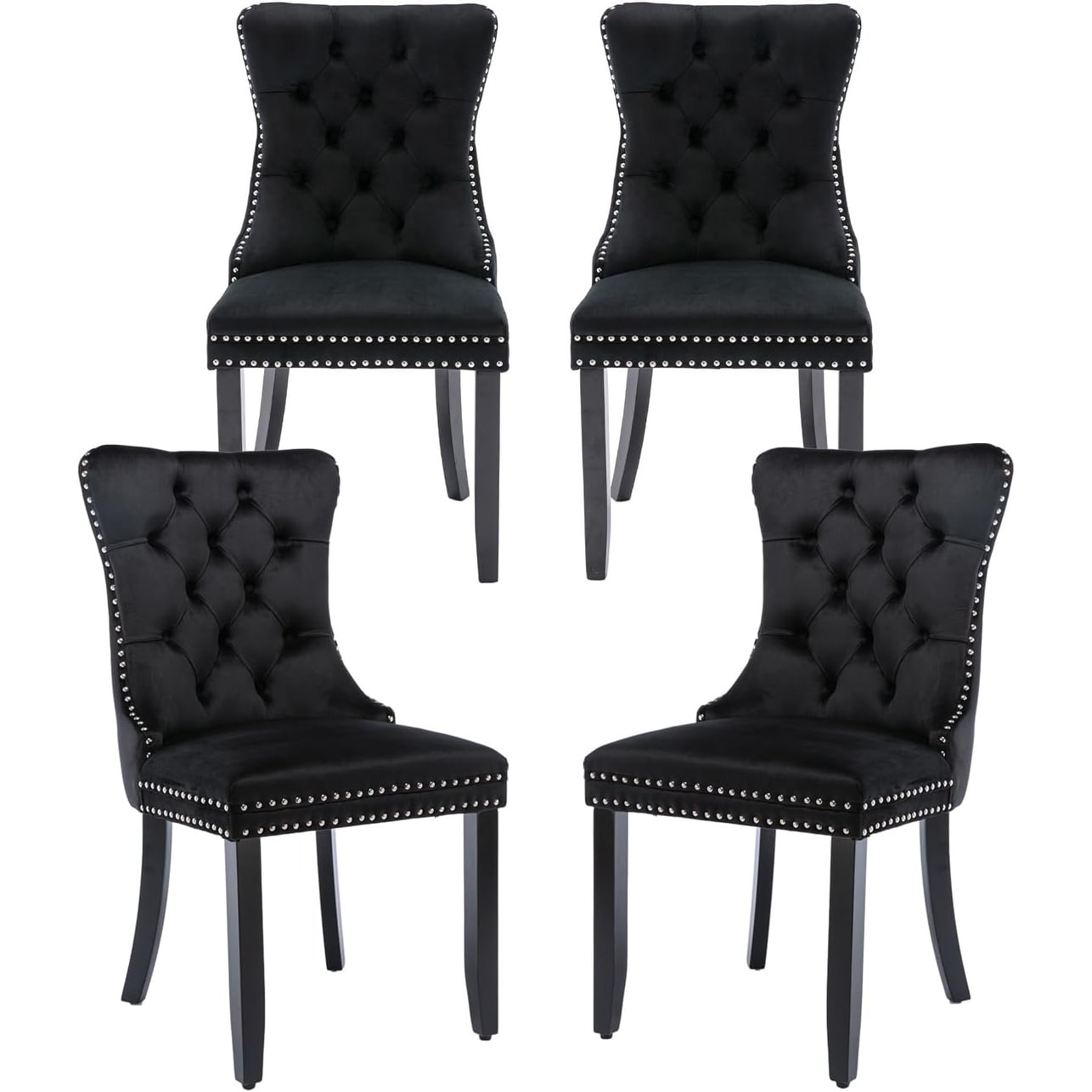 Set of 4 Velvet Upholstered Dining Chairs with Wooden Legs and Nailhead Trim