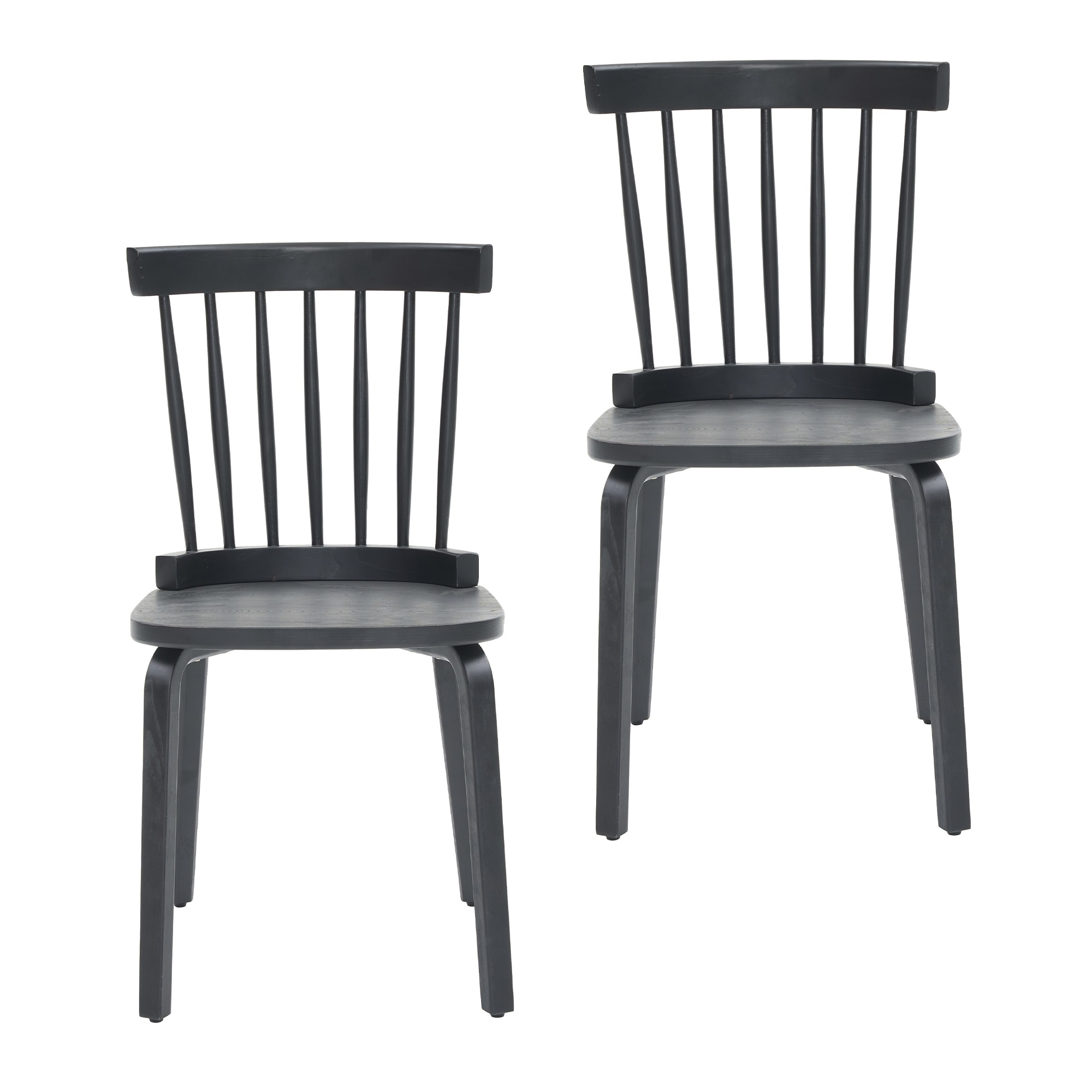 Windsor-style dining chairs with farmhouse spindle back, wide seats, mid-century modern French country design.