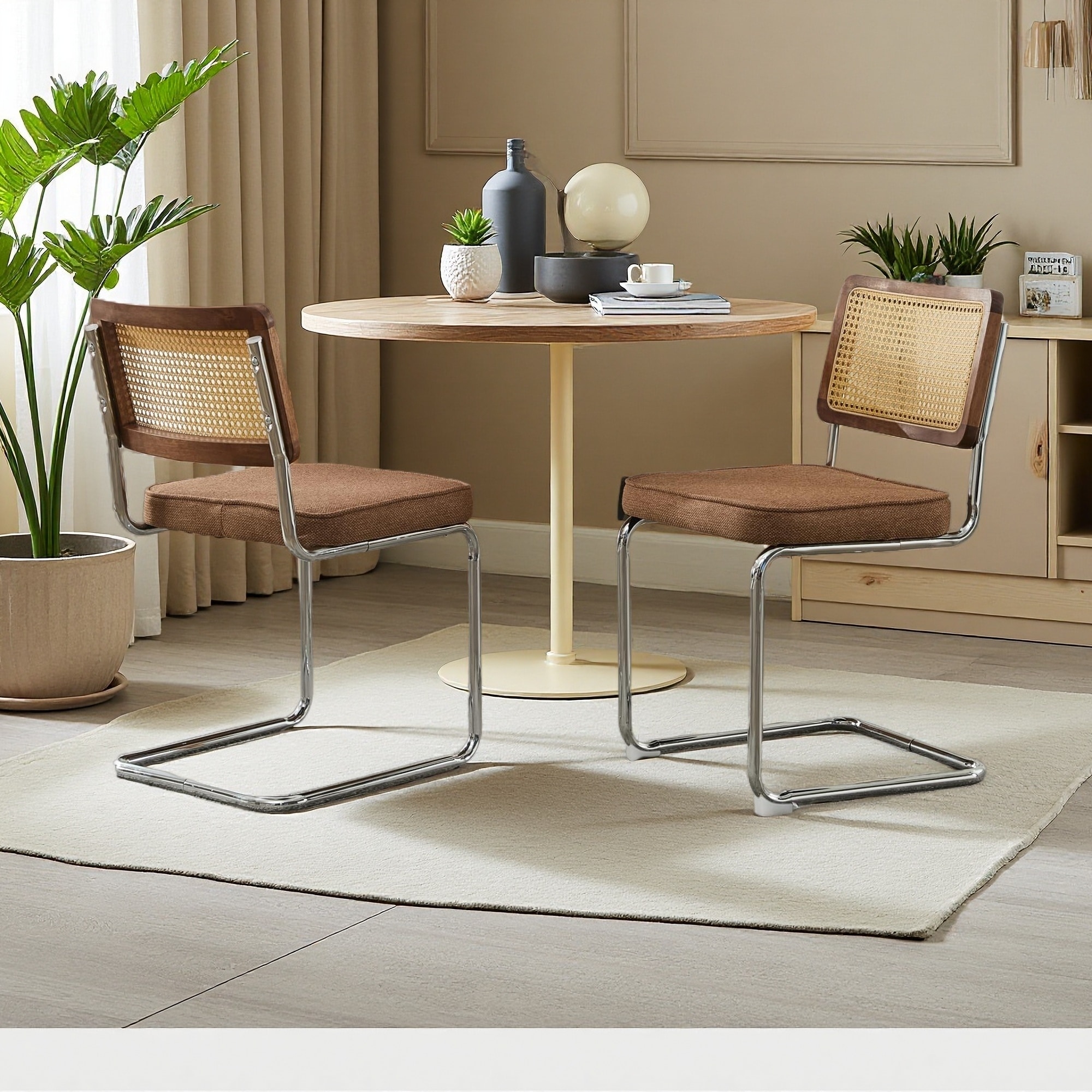 31.9"H Set of 2 Velvet Upholstered Mid-Century Modern Dining Chairs with Natural Rattan Cane Back & Chrome Cantilever Base