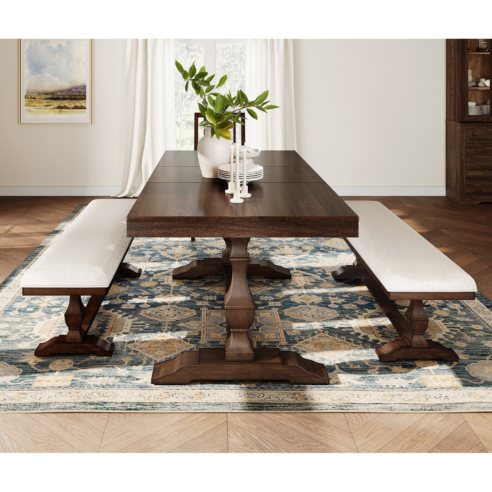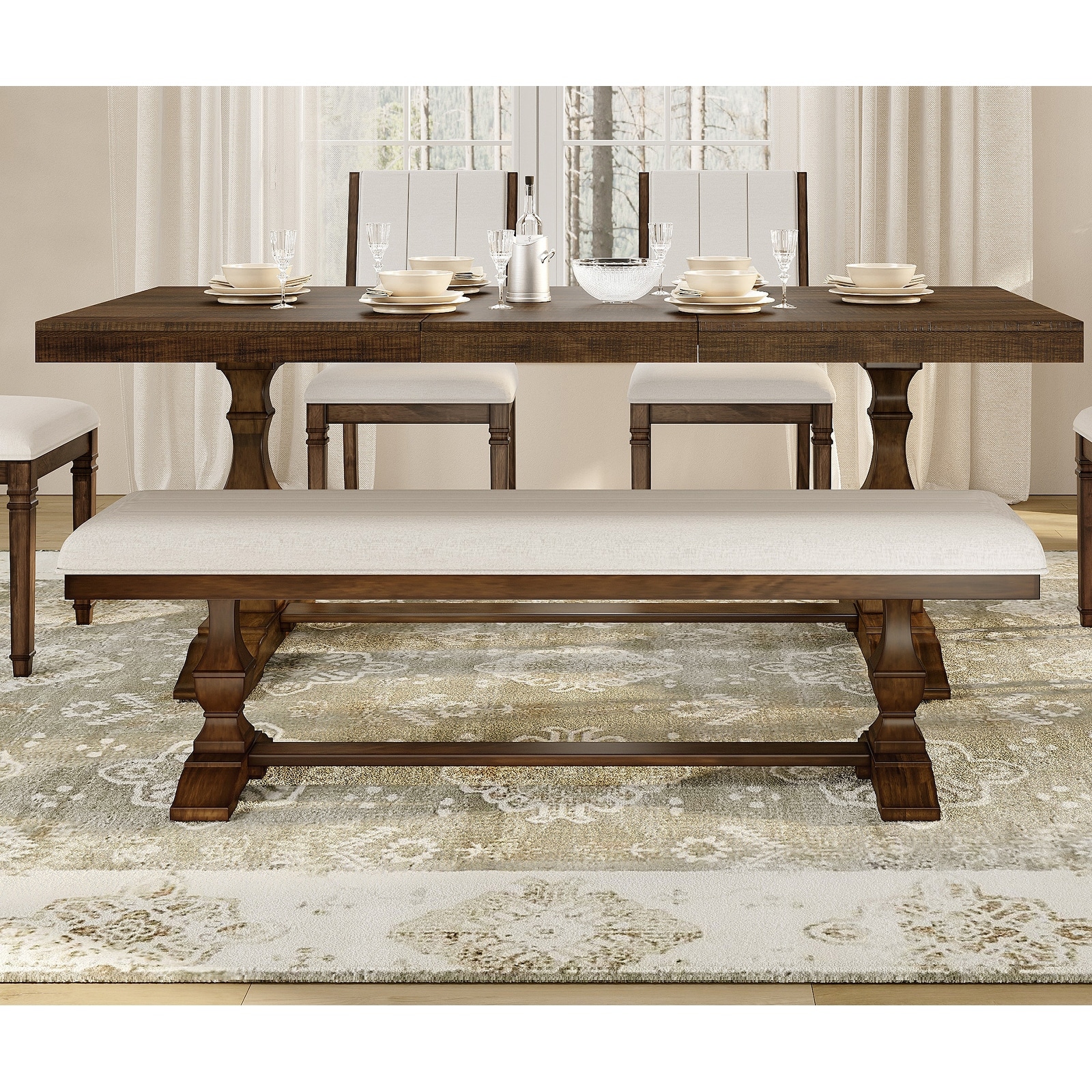 Farmhouse Dining Chair and Bench Set, Solid Wood Upholstered Armless Chair and Dining Bench with Turned Legs