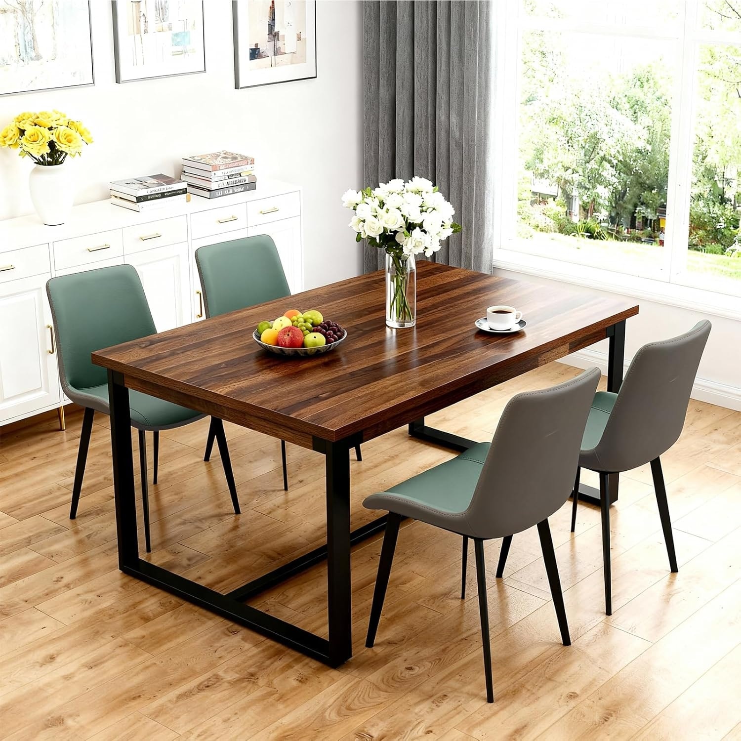 Set of 4 Modern Upholstered Dining Chairs with Ergonomic Backrest and Sturdy Metal Legs in Green & Dark Grey