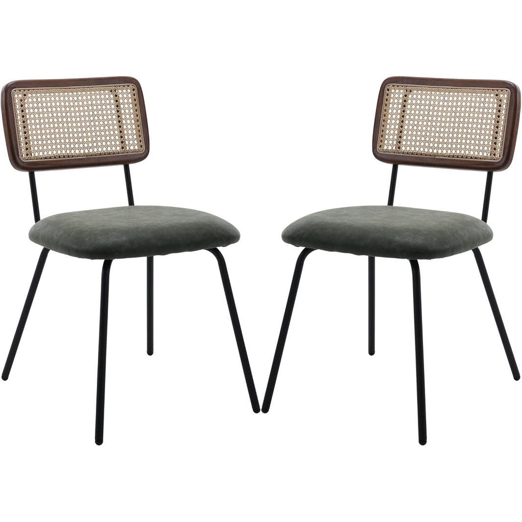 Set of 2 Green PU Leather Upholstered Rattan Dining Chairs with Metal Legs for Living Room