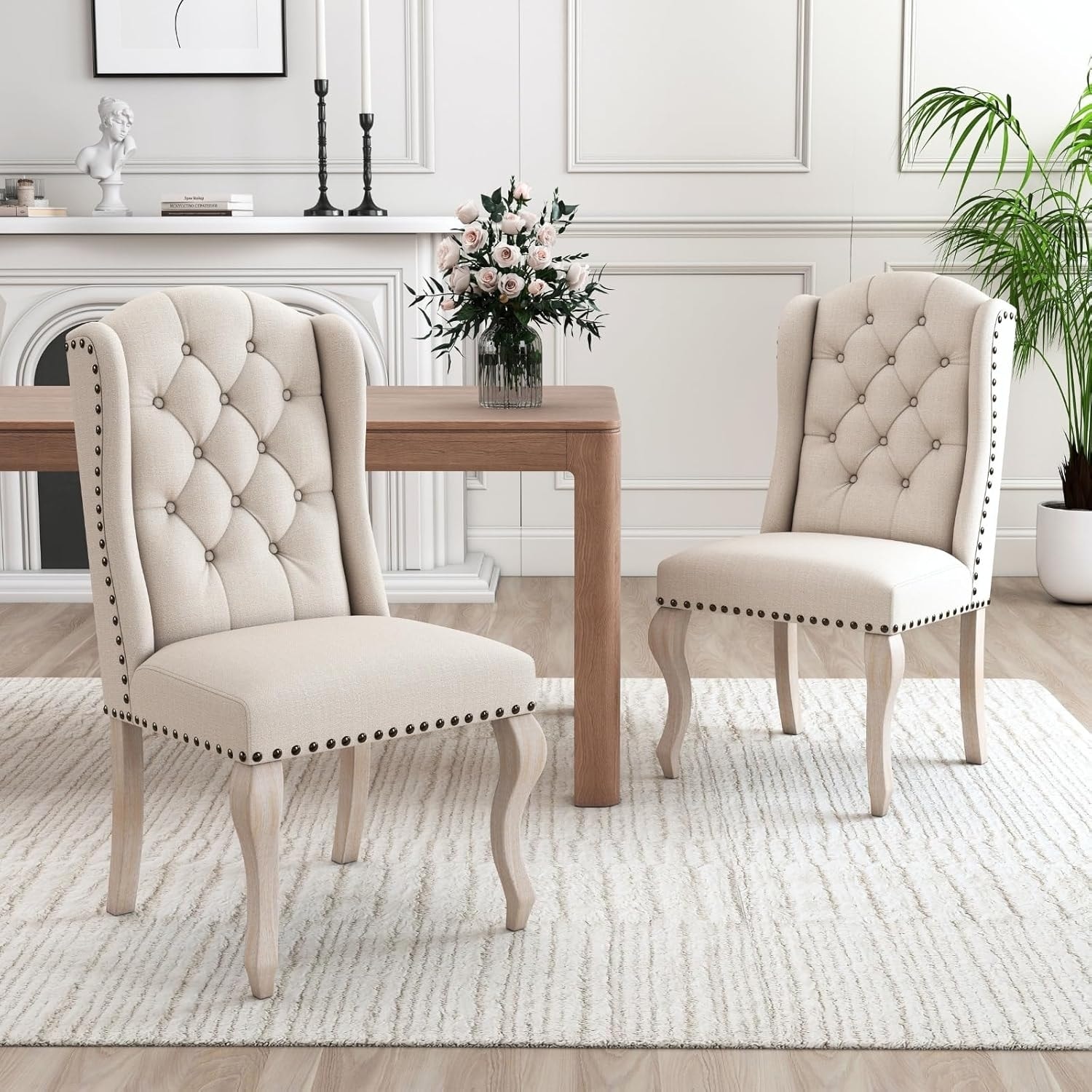Set of 2 French Country Upholstered Dining Chairs with Nailhead Trim & Curved Wood Legs, Beige Linen