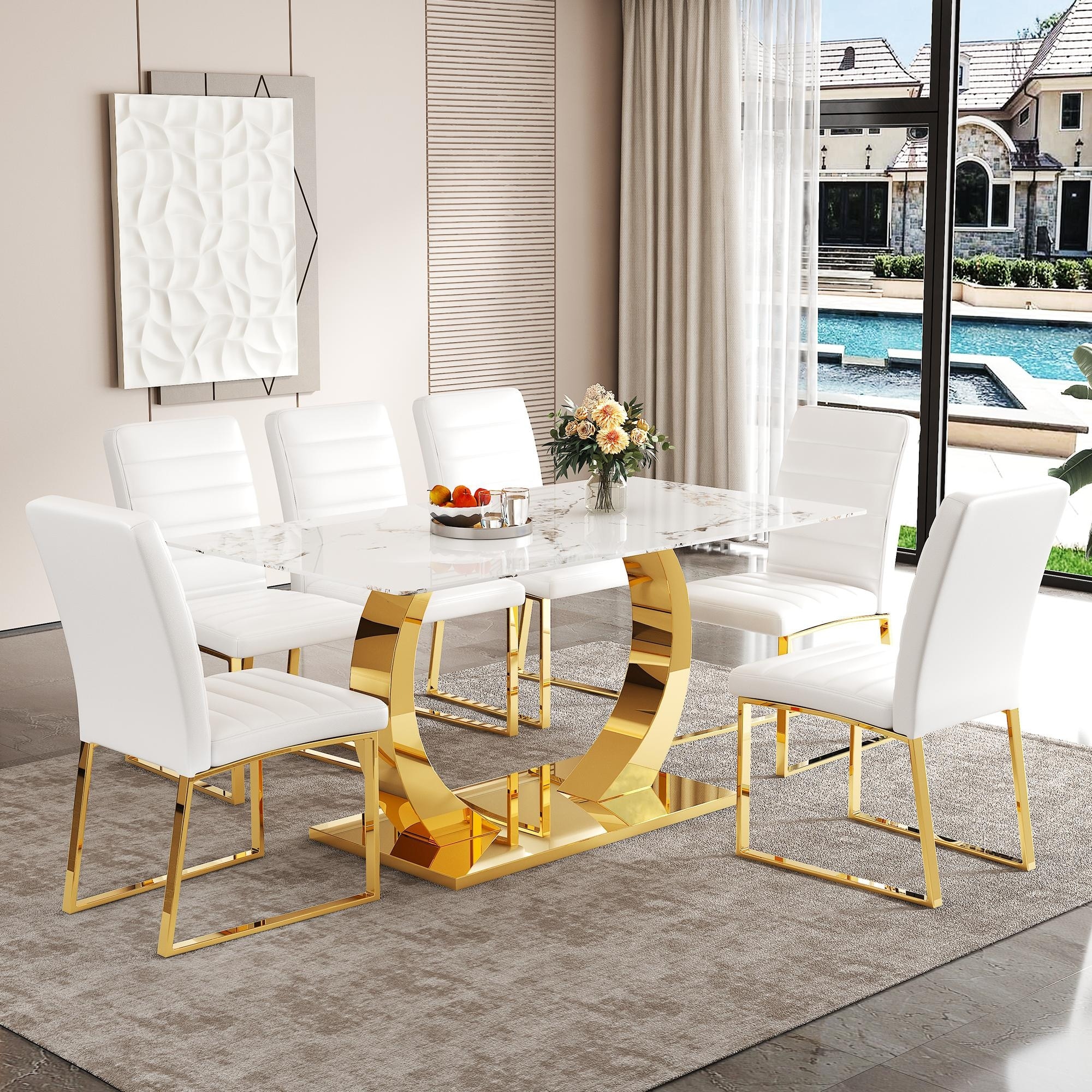 Glam White and Gold Tempered Glass Dining Table Set with Chairs